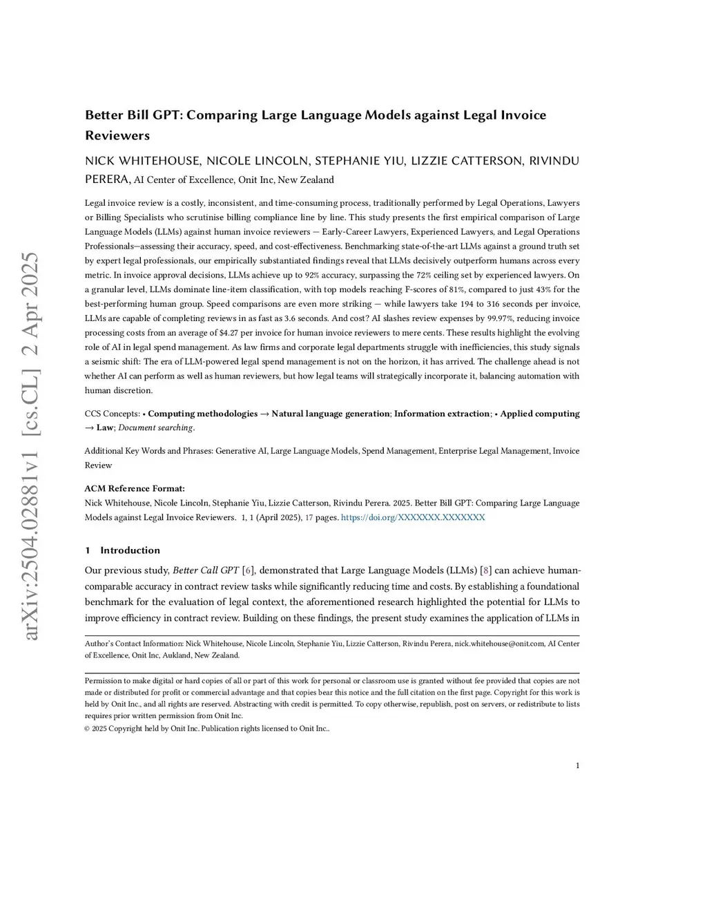 Legal invoice review is a costly, inconsistent, and time-consuming process, traditionally performed by Legal Operations, Lawyers or Billing Specialists who scrutinise billing compliance line by line. This study presents the first empirical comparison of Large Language Models (LLMs) against human invoice reviewers - Early-Career Lawyers, Experienced Lawyers, and Legal Operations Professionals-assessing their accuracy, speed, and cost-effectiveness. Benchmarking state-of-the-art LLMs against a ground truth set by expert legal professionals, our empirically substantiated findings reveal that LLMs decisively outperform humans across every metric. In invoice approval decisions, LLMs achieve up to 92% accuracy, surpassing the 72% ceiling set by experienced lawyers. On a granular level, LLMs dominate line-item classification, with top models reaching F-scores of 81%, compared to just 43% for the best-performing human group. Speed comparisons are even more striking - while lawyers take 194 to 316 seconds per invoice, LLMs are capable of completing reviews in as fast as 3.6 seconds. And cost? AI slashes review expenses by 99.97%, reducing invoice processing costs from an average of $4.27 per invoice for human invoice reviewers to mere cents. These results highlight the evolving role of AI in legal spend management. As law firms and corporate legal departments struggle with inefficiencies, this study signals a seismic shift: The era of LLM-powered legal spend management is not on the horizon, it has arrived. The challenge ahead is not whether AI can perform as well as human reviewers, but how legal teams will strategically incorporate it, balancing automation with human discretion.