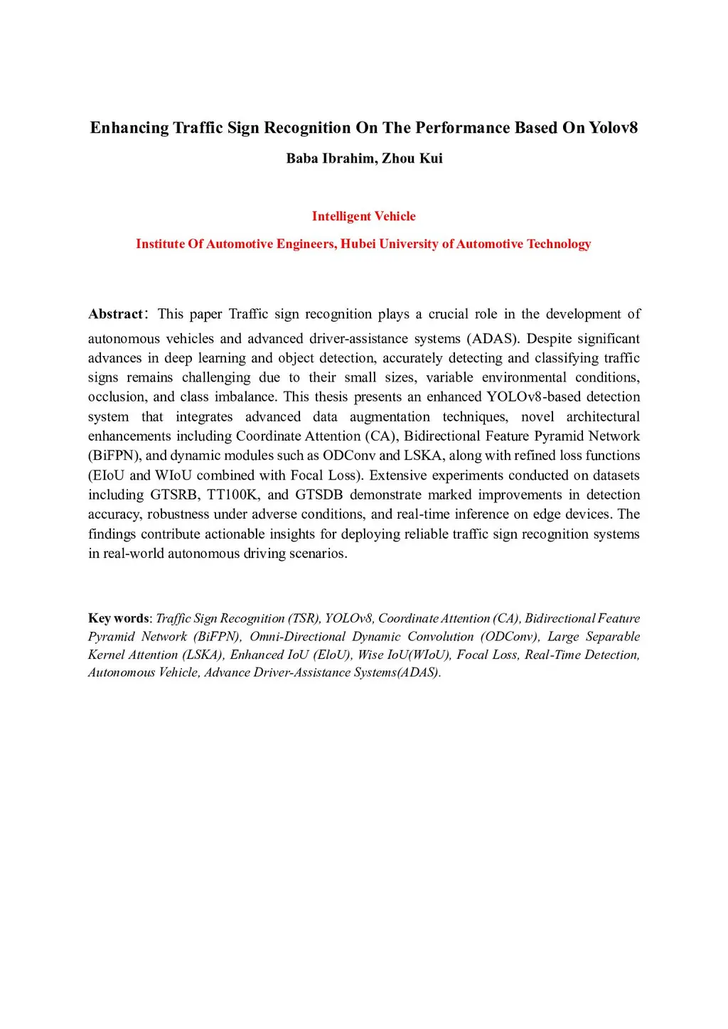 This paper Traffic sign recognition plays a crucial role in the development of autonomous vehicles and advanced driver-assistance systems (ADAS). Despite significant advances in deep learning and object detection, accurately detecting and classifying traffic signs remains challenging due to their small sizes, variable environmental conditions, occlusion, and class imbalance. This thesis presents an enhanced YOLOv8-based detection system that integrates advanced data augmentation techniques, novel architectural enhancements including Coordinate Attention (CA), Bidirectional Feature Pyramid Network (BiFPN), and dynamic modules such as ODConv and LSKA, along with refined loss functions (EIoU and WIoU combined with Focal Loss). Extensive experiments conducted on datasets including GTSRB, TT100K, and GTSDB demonstrate marked improvements in detection accuracy, robustness under adverse conditions, and real-time inference on edge devices. The findings contribute actionable insights for deploying reliable traffic sign recognition systems in real-world autonomous driving scenarios.
