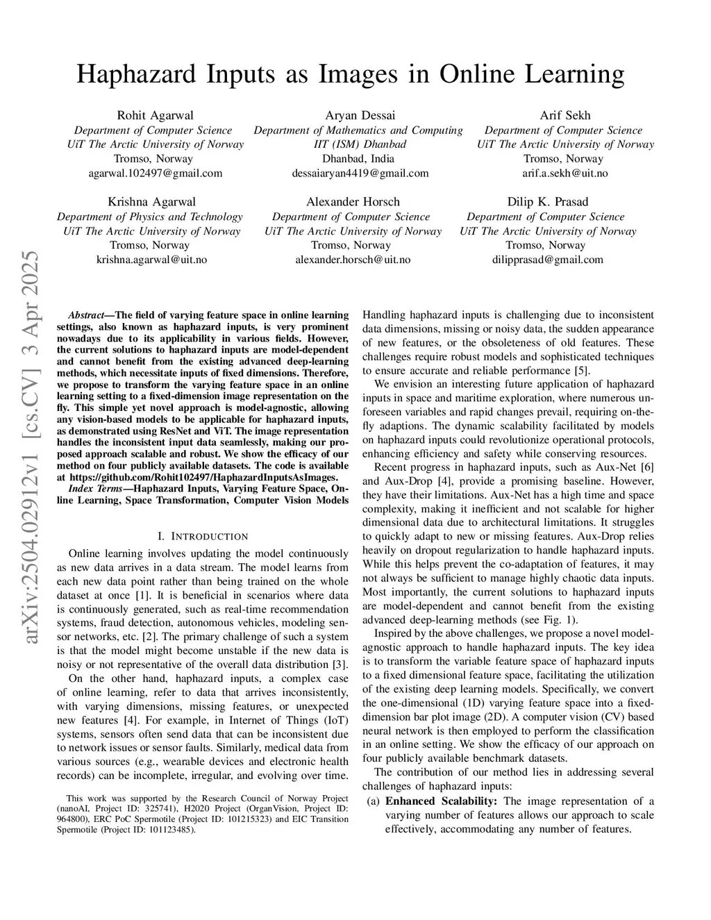 The field of varying feature space in online learning settings, also known as haphazard inputs, is very prominent nowadays due to its applicability in various fields. However, the current solutions to haphazard inputs are model-dependent and cannot benefit from the existing advanced deep-learning methods, which necessitate inputs of fixed dimensions. Therefore, we propose to transform the varying feature space in an online learning setting to a fixed-dimension image representation on the fly. This simple yet novel approach is model-agnostic, allowing any vision-based models to be applicable for haphazard inputs, as demonstrated using ResNet and ViT. The image representation handles the inconsistent input data seamlessly, making our proposed approach scalable and robust. We show the efficacy of our method on four publicly available datasets. The code is available atthis https URL.