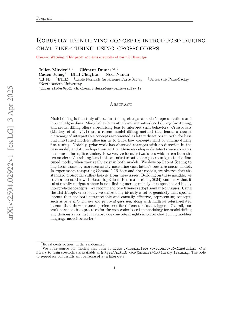 Model diffing is the study of how fine-tuning changes a model's representations and internal algorithms. Many behaviors of interest are introduced during fine-tuning, and model diffing offers a promising lens to interpret such behaviors. Crosscoders are a recent model diffing method that learns a shared dictionary of interpretable concepts represented as latent directions in both the base and fine-tuned models, allowing us to track how concepts shift or emerge during fine-tuning. Notably, prior work has observed concepts with no direction in the base model, and it was hypothesized that these model-specific latents were concepts introduced during fine-tuning. However, we identify two issues which stem from the crosscoders L1 training loss that can misattribute concepts as unique to the fine-tuned model, when they really exist in both models. We develop Latent Scaling to flag these issues by more accurately measuring each latent's presence across models. In experiments comparing Gemma 2 2B base and chat models, we observe that the standard crosscoder suffers heavily from these issues. Building on these insights, we train a crosscoder with BatchTopK loss and show that it substantially mitigates these issues, finding more genuinely chat-specific and highly interpretable concepts. We recommend practitioners adopt similar techniques. Using the BatchTopK crosscoder, we successfully identify a set of chat-specific latents that are both interpretable and causally effective, representing concepts such as and , along with multiple refusal-related latents that show nuanced preferences for different refusal triggers. Overall, our work advances best practices for the crosscoder-based methodology for model diffing and demonstrates that it can provide concrete insights into how chat-tuning modifies model behavior.