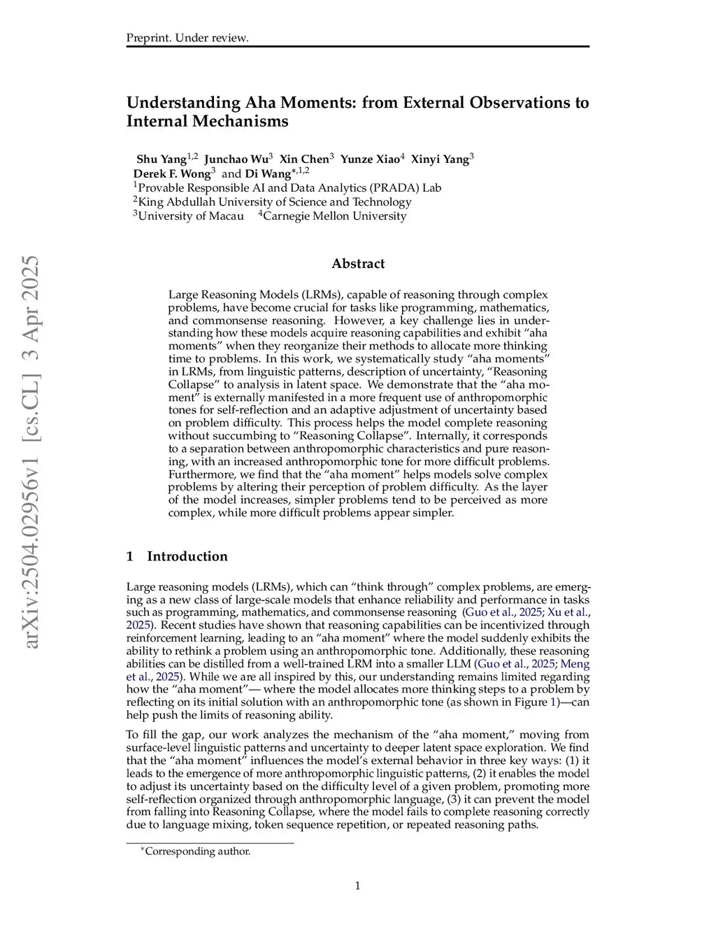 Large Reasoning Models (LRMs), capable of reasoning through complex problems, have become crucial for tasks like programming, mathematics, and commonsense reasoning. However, a key challenge lies in understanding how these models acquire reasoning capabilities and exhibit "aha moments" when they reorganize their methods to allocate more thinking time to problems. In this work, we systematically study "aha moments" in LRMs, from linguistic patterns, description of uncertainty, "Reasoning Collapse" to analysis in latent space. We demonstrate that the "aha moment" is externally manifested in a more frequent use of anthropomorphic tones for self-reflection and an adaptive adjustment of uncertainty based on problem difficulty. This process helps the model complete reasoning without succumbing to "Reasoning Collapse". Internally, it corresponds to a separation between anthropomorphic characteristics and pure reasoning, with an increased anthropomorphic tone for more difficult problems. Furthermore, we find that the "aha moment" helps models solve complex problems by altering their perception of problem difficulty. As the layer of the model increases, simpler problems tend to be perceived as more complex, while more difficult problems appear simpler.