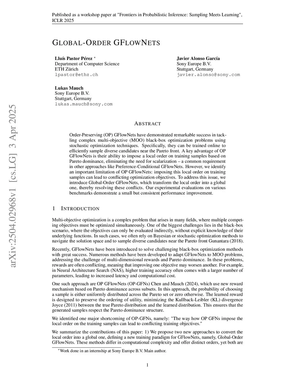 Order-Preserving (OP) GFlowNets have demonstrated remarkable success in tackling complex multi-objective (MOO) black-box optimization problems using stochastic optimization techniques. Specifically, they can be trained online to efficiently sample diverse candidates near the Pareto front. A key advantage of OP GFlowNets is their ability to impose a local order on training samples based on Pareto dominance, eliminating the need for scalarization - a common requirement in other approaches like Preference-Conditional GFlowNets. However, we identify an important limitation of OP GFlowNets: imposing a local order on training samples can lead to conflicting optimization objectives. To address this issue, we introduce Global-Order GFlowNets, which transform the local order into a global one, thereby resolving these conflicts. Our experimental evaluations on various benchmarks demonstrate the efficacy and promise of our proposed method.