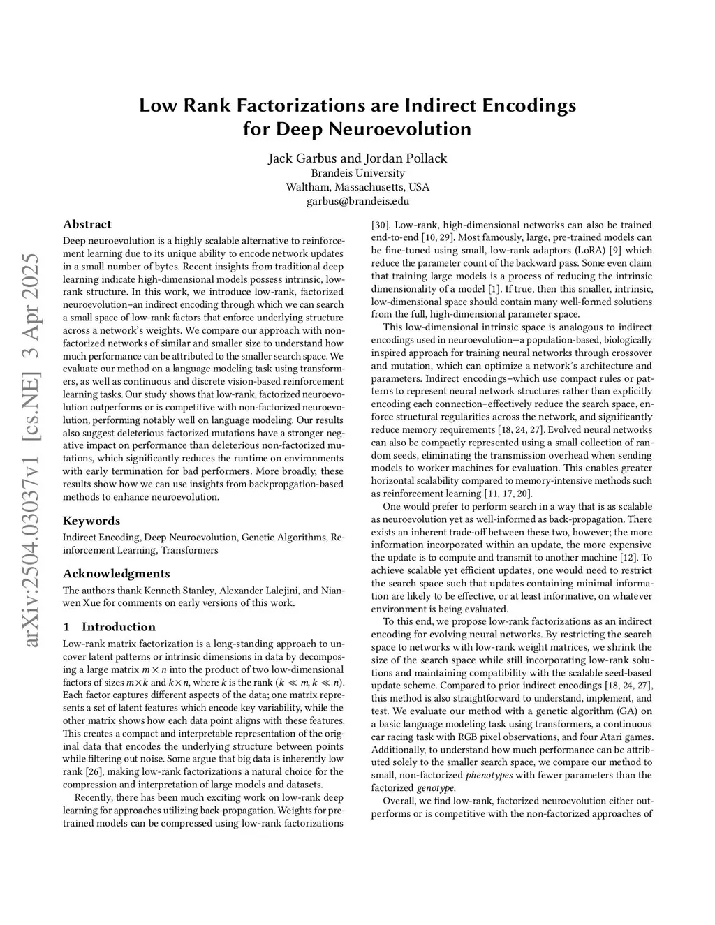 Low Rank Factorizations are Indirect Encodings for Deep Neuroevolution