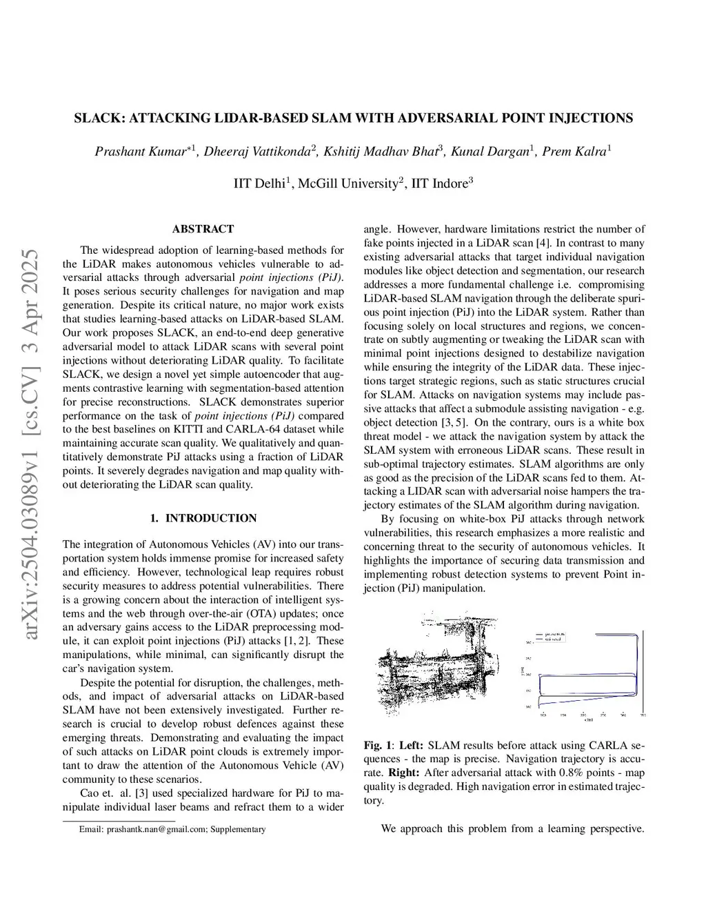 The widespread adoption of learning-based methods for the LiDAR makes autonomous vehicles vulnerable to adversarial attacks through adversarial \textit{point injections (PiJ)}. It poses serious security challenges for navigation and map generation. Despite its critical nature, no major work exists that studies learning-based attacks on LiDAR-based SLAM. Our work proposes SLACK, an end-to-end deep generative adversarial model to attack LiDAR scans with several point injections without deteriorating LiDAR quality. To facilitate SLACK, we design a novel yet simple autoencoder that augments contrastive learning with segmentation-based attention for precise reconstructions. SLACK demonstrates superior performance on the task of \textit{point injections (PiJ)} compared to the best baselines on KITTI and CARLA-64 dataset while maintaining accurate scan quality. We qualitatively and quantitatively demonstrate PiJ attacks using a fraction of LiDAR points. It severely degrades navigation and map quality without deteriorating the LiDAR scan quality.
