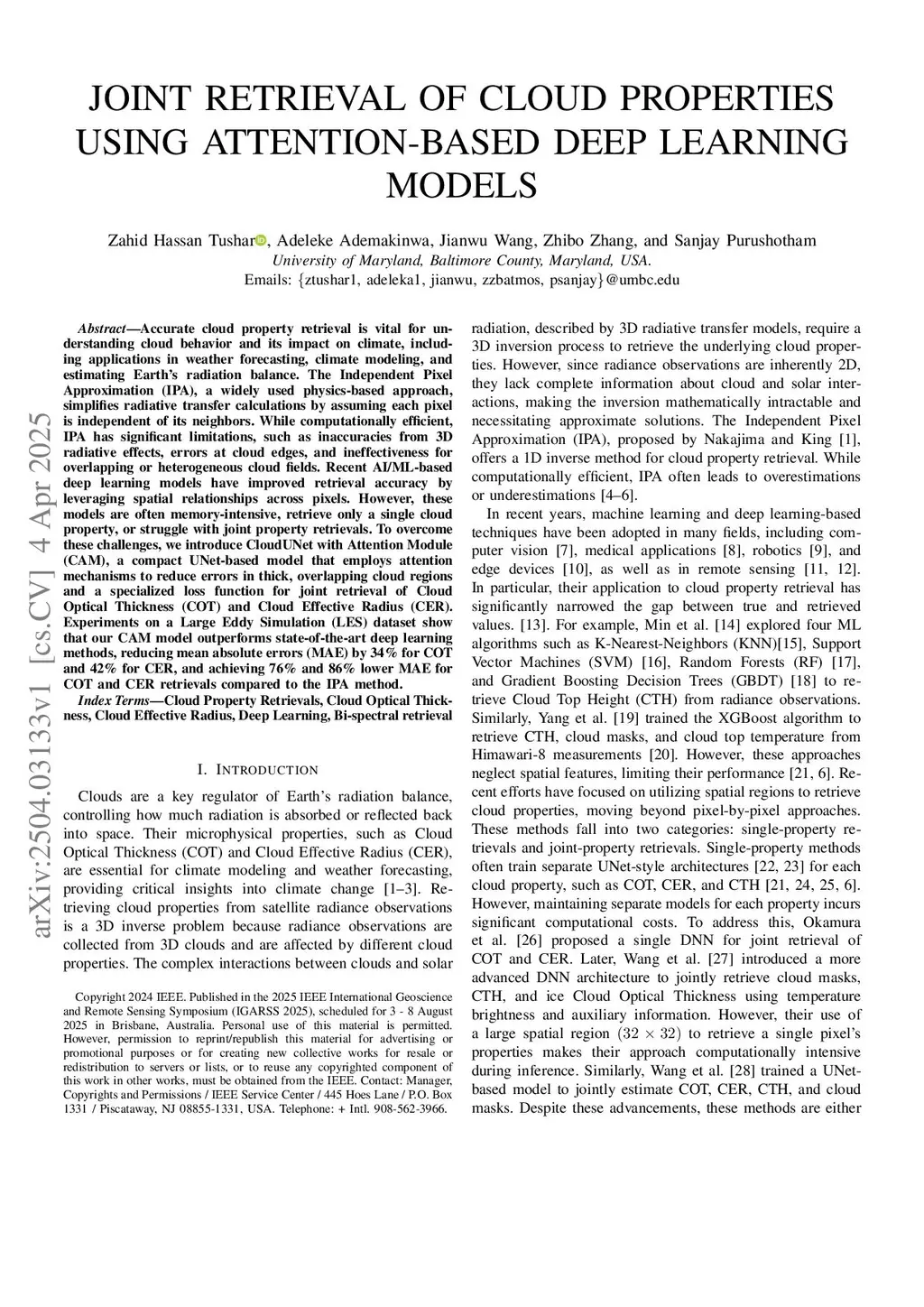 Accurate cloud property retrieval is vital for understanding cloud behavior and its impact on climate, including applications in weather forecasting, climate modeling, and estimating Earth's radiation balance. The Independent Pixel Approximation (IPA), a widely used physics-based approach, simplifies radiative transfer calculations by assuming each pixel is independent of its neighbors. While computationally efficient, IPA has significant limitations, such as inaccuracies from 3D radiative effects, errors at cloud edges, and ineffectiveness for overlapping or heterogeneous cloud fields. Recent AI/ML-based deep learning models have improved retrieval accuracy by leveraging spatial relationships across pixels. However, these models are often memory-intensive, retrieve only a single cloud property, or struggle with joint property retrievals. To overcome these challenges, we introduce CloudUNet with Attention Module (CAM), a compact UNet-based model that employs attention mechanisms to reduce errors in thick, overlapping cloud regions and a specialized loss function for joint retrieval of Cloud Optical Thickness (COT) and Cloud Effective Radius (CER). Experiments on a Large Eddy Simulation (LES) dataset show that our CAM model outperforms state-of-the-art deep learning methods, reducing mean absolute errors (MAE) by 34% for COT and 42% for CER, and achieving 76% and 86% lower MAE for COT and CER retrievals compared to the IPA method.
