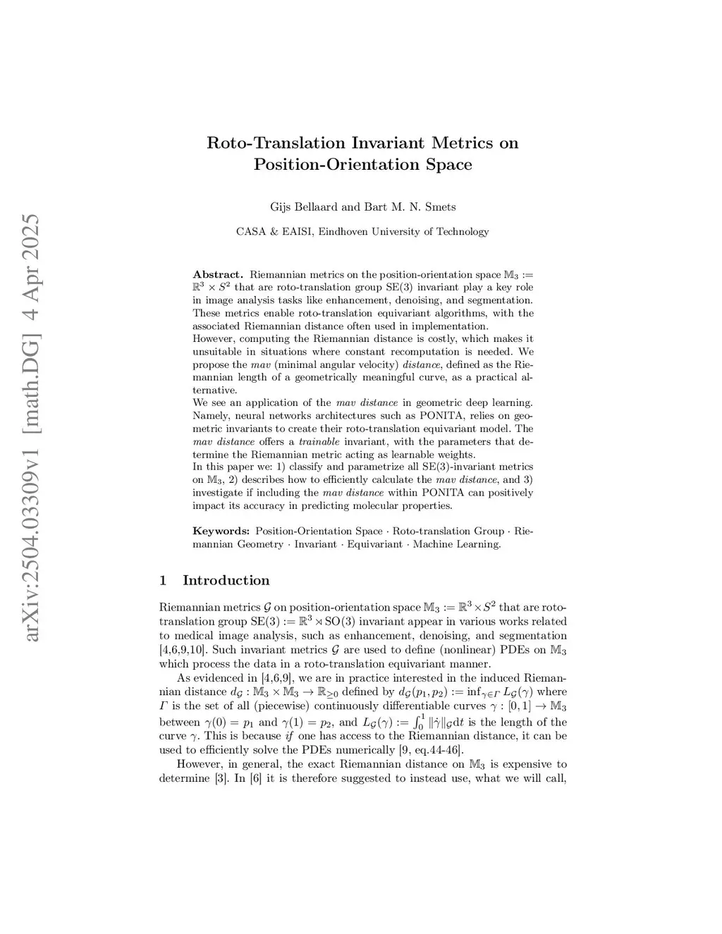 Riemannian metrics on the position-orientation space M(3) that are roto-translation group SE(3) invariant play a key role in image analysis tasks like enhancement, denoising, and segmentation. These metrics enable roto-translation equivariant algorithms, with the associated Riemannian distance often used in implementation.However, computing the Riemannian distance is costly, which makes it unsuitable in situations where constant recomputation is needed. We propose the mav (minimal angular velocity) distance, defined as the Riemannian length of a geometrically meaningful curve, as a practical alternative.We see an application of the mav distance in geometric deep learning. Namely, neural networks architectures such as PONITA, relies on geometric invariants to create their roto-translation equivariant model. The mav distance offers a trainable invariant, with the parameters that determine the Riemannian metric acting as learnable weights.In this paper we: 1) classify and parametrize all SE(3) invariant metrics on M(3), 2) describes how to efficiently calculate the mav distance, and 3) investigate if including the mav distance within PONITA can positively impact its accuracy in predicting molecular properties.