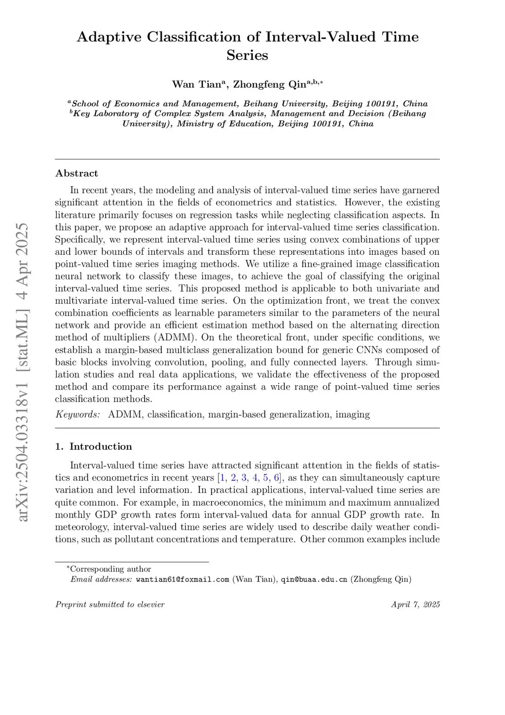 In recent years, the modeling and analysis of interval-valued time series have garnered significant attention in the fields of econometrics and statistics. However, the existing literature primarily focuses on regression tasks while neglecting classification aspects. In this paper, we propose an adaptive approach for interval-valued time series classification. Specifically, we represent interval-valued time series using convex combinations of upper and lower bounds of intervals and transform these representations into images based on point-valued time series imaging methods. We utilize a fine-grained image classification neural network to classify these images, to achieve the goal of classifying the original interval-valued time series. This proposed method is applicable to both univariate and multivariate interval-valued time series. On the optimization front, we treat the convex combination coefficients as learnable parameters similar to the parameters of the neural network and provide an efficient estimation method based on the alternating direction method of multipliers (ADMM). On the theoretical front, under specific conditions, we establish a margin-based multiclass generalization bound for generic CNNs composed of basic blocks involving convolution, pooling, and fully connected layers. Through simulation studies and real data applications, we validate the effectiveness of the proposed method and compare its performance against a wide range of point-valued time series classification methods.