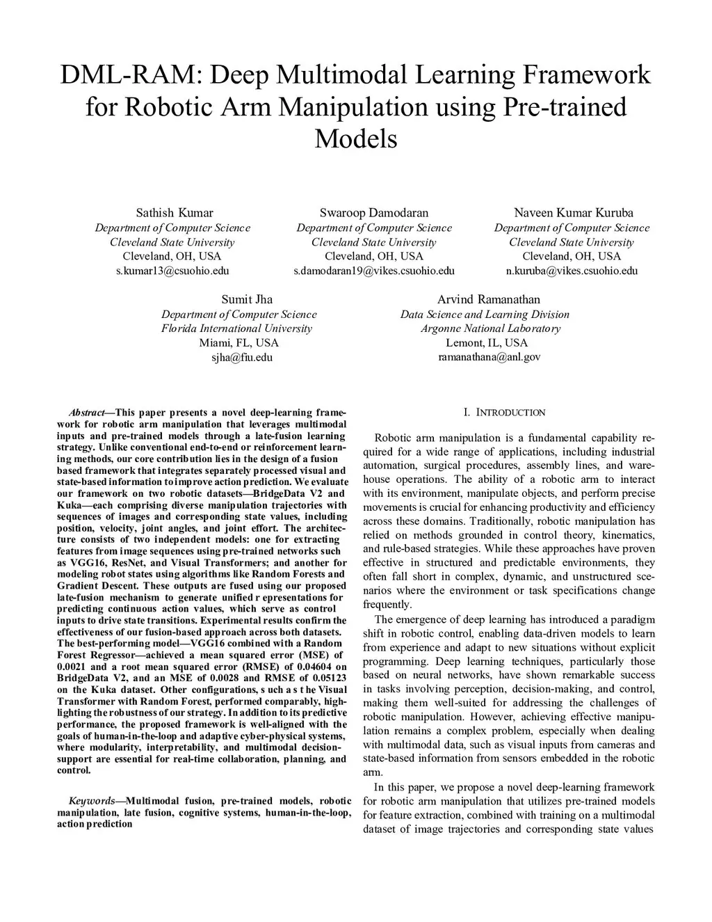 DML-RAM: Deep Multimodal Learning Framework for Robotic Arm Manipulation using Pre-trained Models