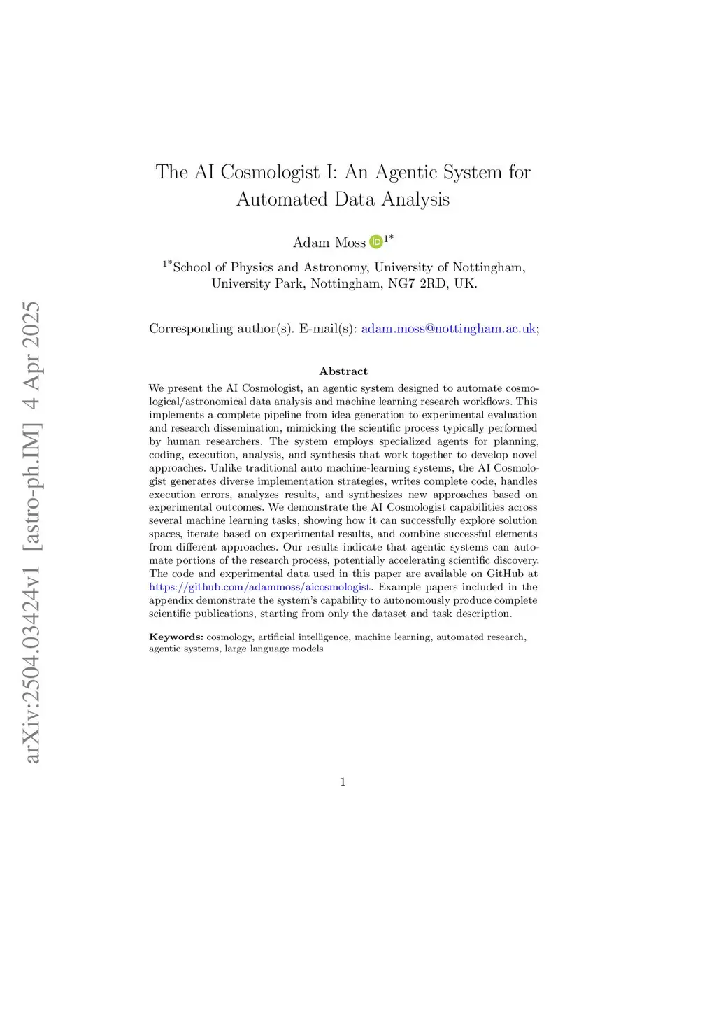 We present the AI Cosmologist, an agentic system designed to automate cosmological/astronomical data analysis and machine learning research workflows. This implements a complete pipeline from idea generation to experimental evaluation and research dissemination, mimicking the scientific process typically performed by human researchers. The system employs specialized agents for planning, coding, execution, analysis, and synthesis that work together to develop novel approaches. Unlike traditional auto machine-learning systems, the AI Cosmologist generates diverse implementation strategies, writes complete code, handles execution errors, analyzes results, and synthesizes new approaches based on experimental outcomes. We demonstrate the AI Cosmologist capabilities across several machine learning tasks, showing how it can successfully explore solution spaces, iterate based on experimental results, and combine successful elements from different approaches. Our results indicate that agentic systems can automate portions of the research process, potentially accelerating scientific discovery. The code and experimental data used in this paper are available on GitHub atthis https URL. Example papers included in the appendix demonstrate the system's capability to autonomously produce complete scientific publications, starting from only the dataset and task description