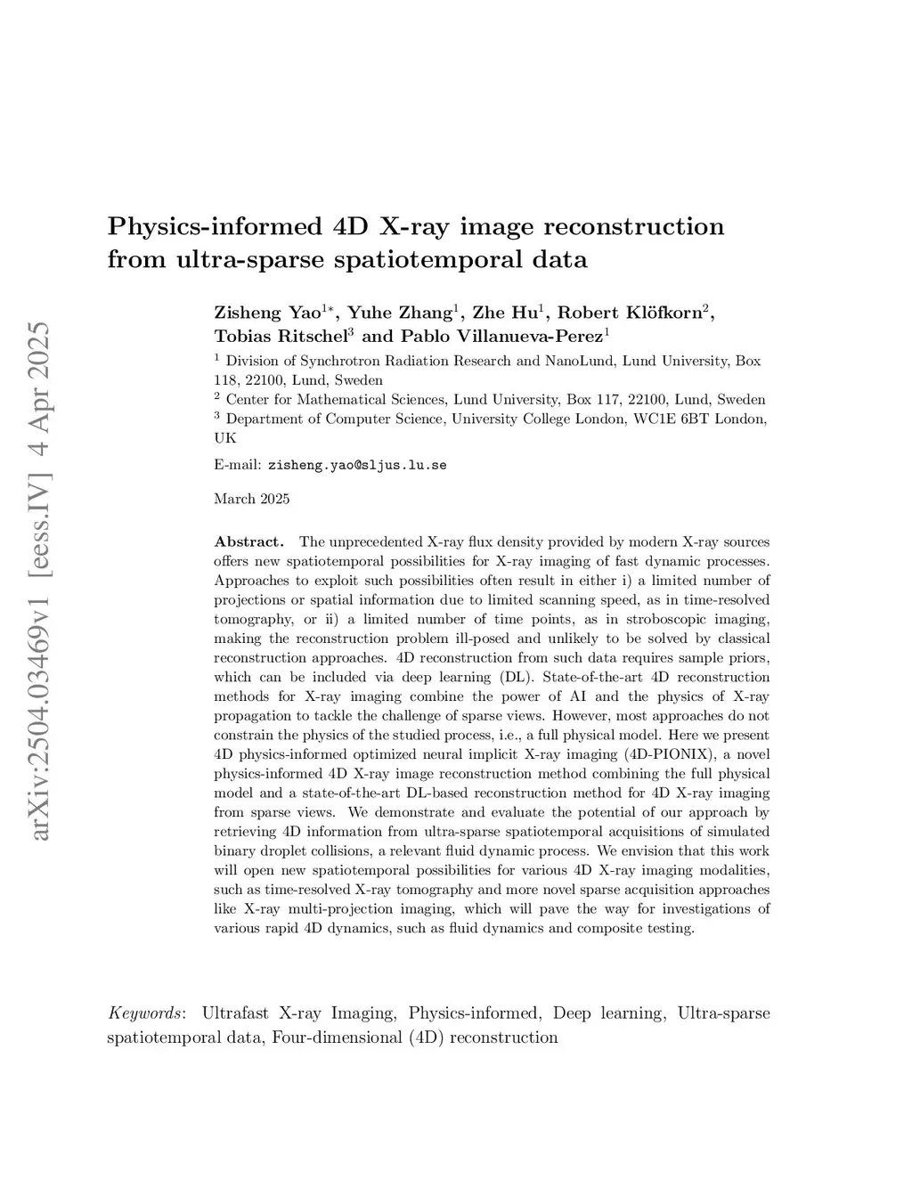 The unprecedented X-ray flux density provided by modern X-ray sources offers new spatiotemporal possibilities for X-ray imaging of fast dynamic processes. Approaches to exploit such possibilities often result in either i) a limited number of projections or spatial information due to limited scanning speed, as in time-resolved tomography, or ii) a limited number of time points, as in stroboscopic imaging, making the reconstruction problem ill-posed and unlikely to be solved by classical reconstruction approaches. 4D reconstruction from such data requires sample priors, which can be included via deep learning (DL). State-of-the-art 4D reconstruction methods for X-ray imaging combine the power of AI and the physics of X-ray propagation to tackle the challenge of sparse views. However, most approaches do not constrain the physics of the studied process, i.e., a full physical model. Here we present 4D physics-informed optimized neural implicit X-ray imaging (4D-PIONIX), a novel physics-informed 4D X-ray image reconstruction method combining the full physical model and a state-of-the-art DL-based reconstruction method for 4D X-ray imaging from sparse views. We demonstrate and evaluate the potential of our approach by retrieving 4D information from ultra-sparse spatiotemporal acquisitions of simulated binary droplet collisions, a relevant fluid dynamic process. We envision that this work will open new spatiotemporal possibilities for various 4D X-ray imaging modalities, such as time-resolved X-ray tomography and more novel sparse acquisition approaches like X-ray multi-projection imaging, which will pave the way for investigations of various rapid 4D dynamics, such as fluid dynamics and composite testing.
