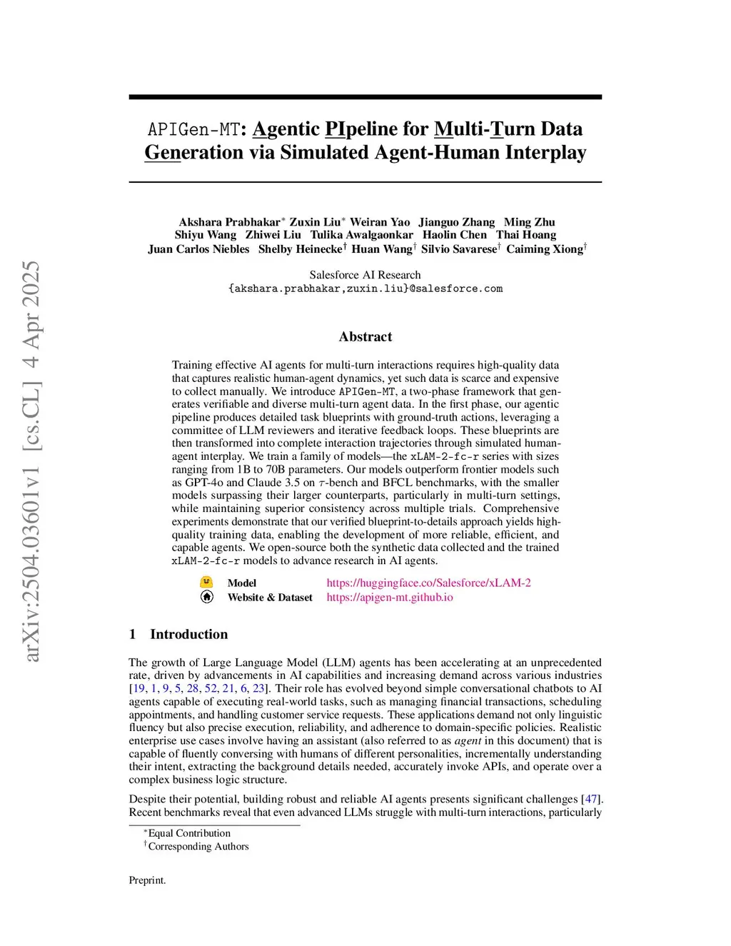 Training effective AI agents for multi-turn interactions requires high-quality data that captures realistic human-agent dynamics, yet such data is scarce and expensive to collect manually. We introduce APIGen-MT, a two-phase framework that generates verifiable and diverse multi-turn agent data. In the first phase, our agentic pipeline produces detailed task blueprints with ground-truth actions, leveraging a committee of LLM reviewers and iterative feedback loops. These blueprints are then transformed into complete interaction trajectories through simulated human-agent interplay. We train a family of models -- the xLAM-2-fc-r series with sizes ranging from 1B to 70B parameters. Our models outperform frontier models such as GPT-4o and Claude 3.5 on -bench and BFCL benchmarks, with the smaller models surpassing their larger counterparts, particularly in multi-turn settings, while maintaining superior consistency across multiple trials. Comprehensive experiments demonstrate that our verified blueprint-to-details approach yields high-quality training data, enabling the development of more reliable, efficient, and capable agents. We open-source 5K synthetic data trajectories and the trained xLAM-2-fc-r models to advance research in AI agents.Models atthis https URLDataset atthis https URLand Website atthis https URL