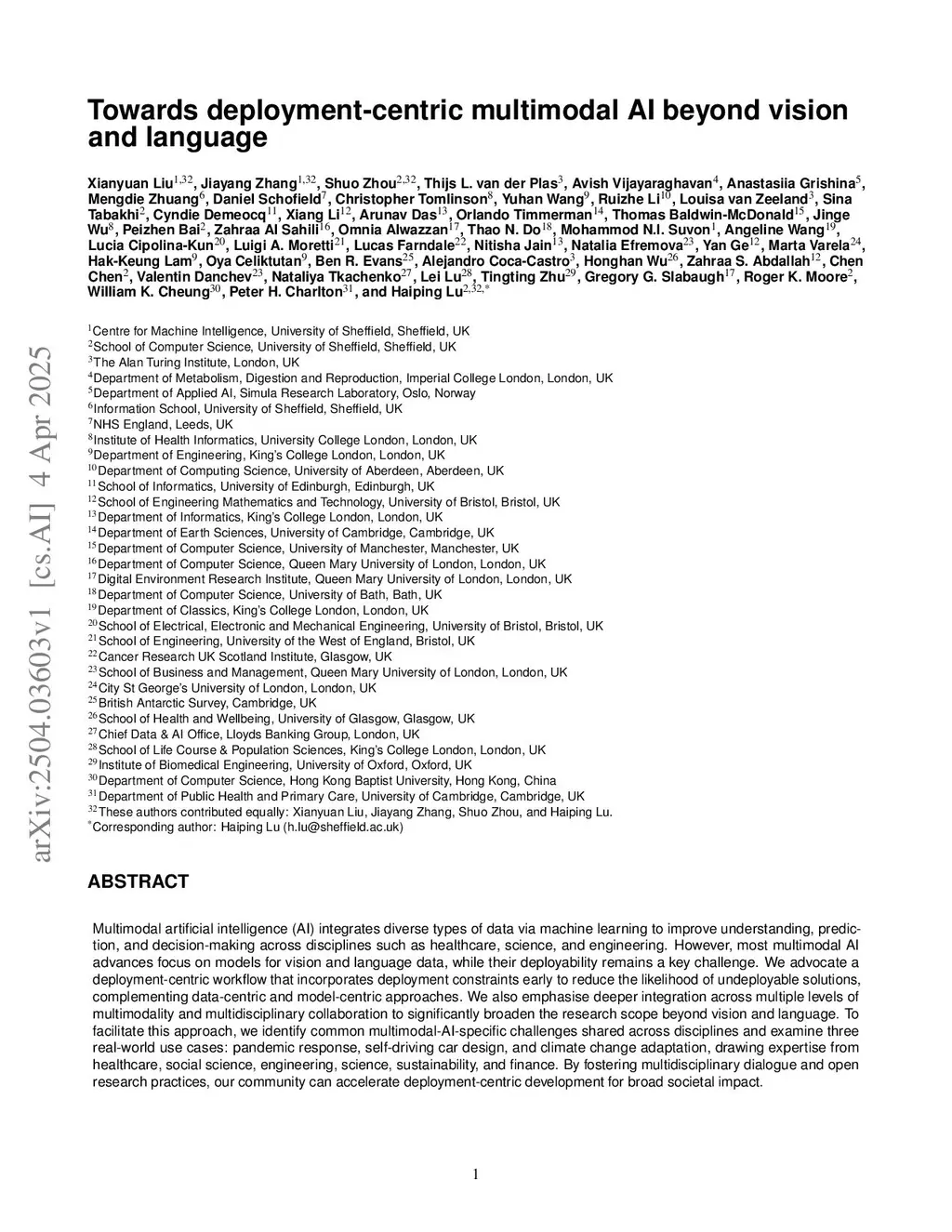 Multimodal artificial intelligence (AI) integrates diverse types of data via machine learning to improve understanding, prediction, and decision-making across disciplines such as healthcare, science, and engineering. However, most multimodal AI advances focus on models for vision and language data, while their deployability remains a key challenge. We advocate a deployment-centric workflow that incorporates deployment constraints early to reduce the likelihood of undeployable solutions, complementing data-centric and model-centric approaches. We also emphasise deeper integration across multiple levels of multimodality and multidisciplinary collaboration to significantly broaden the research scope beyond vision and language. To facilitate this approach, we identify common multimodal-AI-specific challenges shared across disciplines and examine three real-world use cases: pandemic response, self-driving car design, and climate change adaptation, drawing expertise from healthcare, social science, engineering, science, sustainability, and finance. By fostering multidisciplinary dialogue and open research practices, our community can accelerate deployment-centric development for broad societal impact.