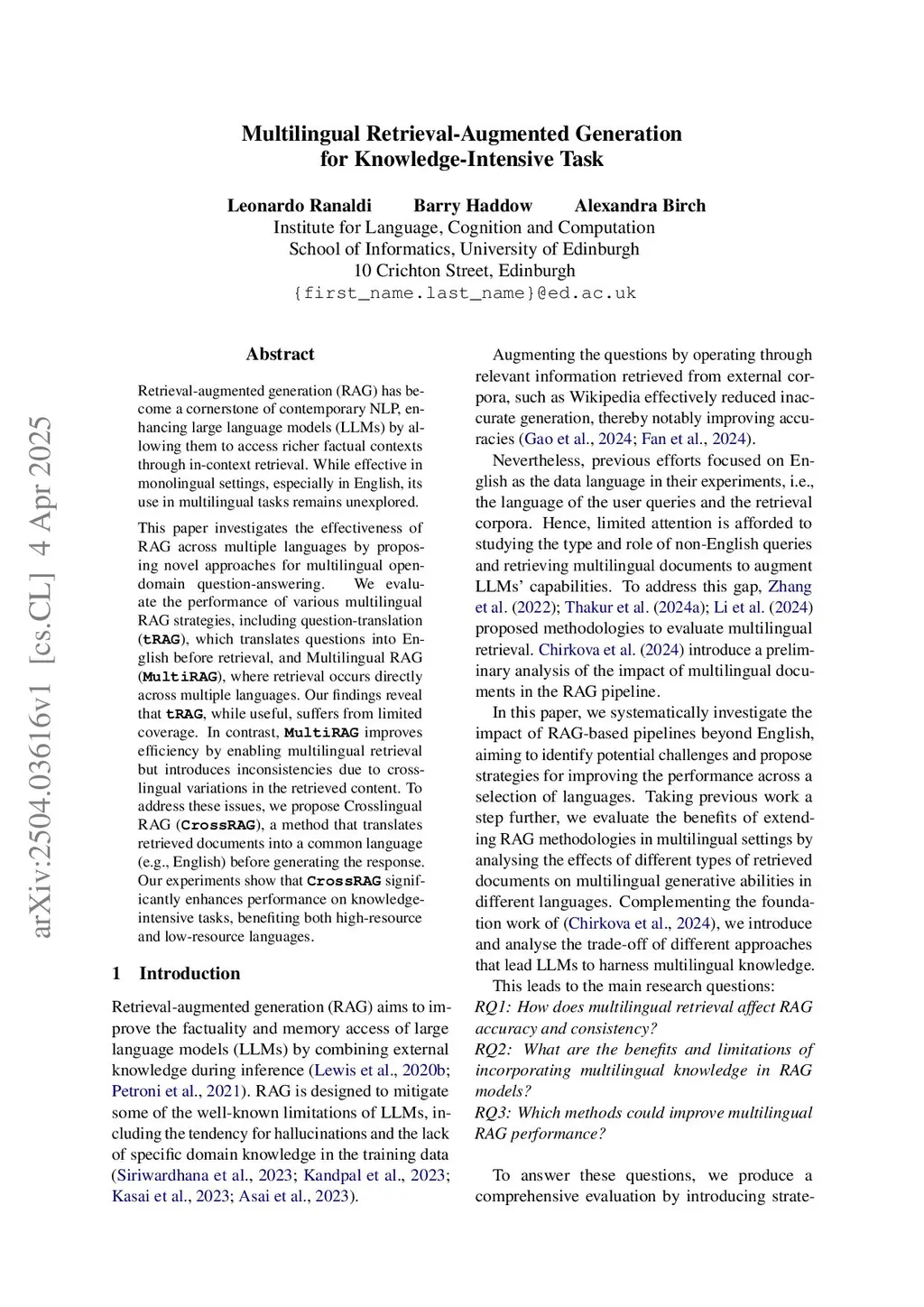 Multilingual Retrieval-Augmented Generation for Knowledge-Intensive Task