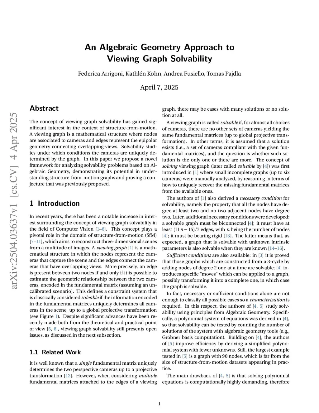 The concept of viewing graph solvability has gained significant interest in the context of structure-from-motion. A viewing graph is a mathematical structure where nodes are associated to cameras and edges represent the epipolar geometry connecting overlapping views. Solvability studies under which conditions the cameras are uniquely determined by the graph. In this paper we propose a novel framework for analyzing solvability problems based on Algebraic Geometry, demonstrating its potential in understanding structure-from-motion graphs and proving a conjecture that was previously proposed.