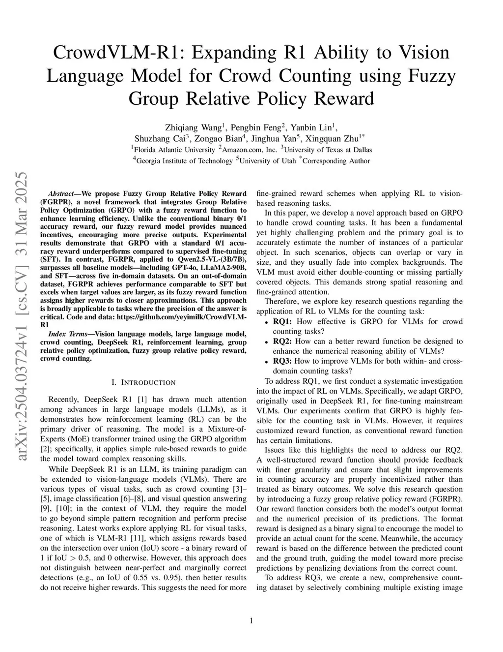 CrowdVLM-R1: Expanding R1 Ability to Vision Language Model for Crowd Counting using Fuzzy Group Relative Policy Reward