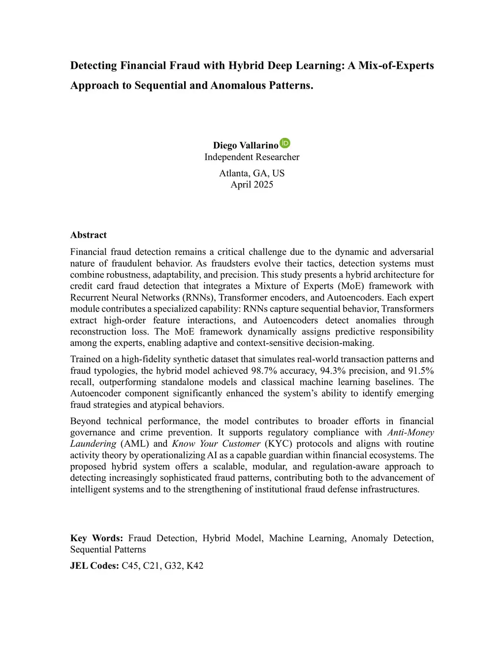 Financial fraud detection remains a critical challenge due to the dynamic and adversarial nature of fraudulent behavior. As fraudsters evolve their tactics, detection systems must combine robustness, adaptability, and precision. This study presents a hybrid architecture for credit card fraud detection that integrates a Mixture of Experts (MoE) framework with Recurrent Neural Networks (RNNs), Transformer encoders, and Autoencoders. Each expert module contributes a specialized capability: RNNs capture sequential behavior, Transformers extract high-order feature interactions, and Autoencoders detect anomalies through reconstruction loss. The MoE framework dynamically assigns predictive responsibility among the experts, enabling adaptive and context-sensitive decision-making.Trained on a high-fidelity synthetic dataset that simulates real-world transaction patterns and fraud typologies, the hybrid model achieved 98.7 percent accuracy, 94.3 percent precision, and 91.5 percent recall, outperforming standalone models and classical machine learning baselines. The Autoencoder component significantly enhanced the system's ability to identify emerging fraud strategies and atypical behaviors.Beyond technical performance, the model contributes to broader efforts in financial governance and crime prevention. It supports regulatory compliance with Anti-Money Laundering (AML) and Know Your Customer (KYC) protocols and aligns with routine activity theory by operationalizing AI as a capable guardian within financial ecosystems. The proposed hybrid system offers a scalable, modular, and regulation-aware approach to detecting increasingly sophisticated fraud patterns, contributing both to the advancement of intelligent systems and to the strengthening of institutional fraud defense infrastructures.