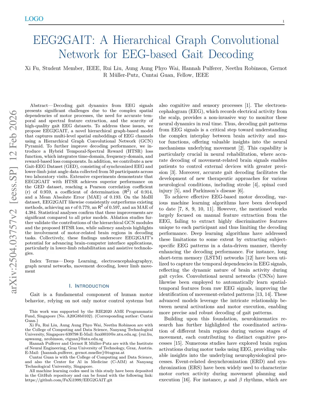 Decoding gait dynamics from EEG signals presents significant challenges due to the complex spatial dependencies of motor processes, the need for accurate temporal and spectral feature extraction, and the scarcity of high-quality gait EEG datasets. To address these issues, we propose EEG2GAIT, a novel hierarchical graph-based model that captures multi-level spatial embeddings of EEG channels using a Hierarchical Graph Convolutional Network (GCN) Pyramid. To further improve decoding performance, we introduce a Hybrid Temporal-Spectral Reward (HTSR) loss function, which integrates time-domain, frequency-domain, and reward-based loss components. In addition, we contribute a new Gait-EEG Dataset (GED), consisting of synchronized EEG and lower-limb joint angle data collected from 50 participants across two laboratory visits. Extensive experiments demonstrate that EEG2GAIT with HTSR achieves superior performance on the GED dataset, reaching a Pearson correlation coefficient (r) of 0.959, a coefficient of determination of 0.914, and a Mean Absolute Error (MAE) of 0.193. On the MoBI dataset, EEG2GAIT likewise consistently outperforms existing methods, achieving an r of 0.779, a coefficient of determination of 0.597, and an MAE of 4.384. Statistical analyses confirm that these improvements are significant compared to all prior models. Ablation studies further validate the contributions of the hierarchical GCN modules and the proposed HTSR loss, while saliency analysis highlights the involvement of motor-related brain regions in decoding tasks. Collectively, these findings underscore EEG2GAIT's potential for advancing brain-computer interface applications, particularly in lower-limb rehabilitation and assistive technologies.