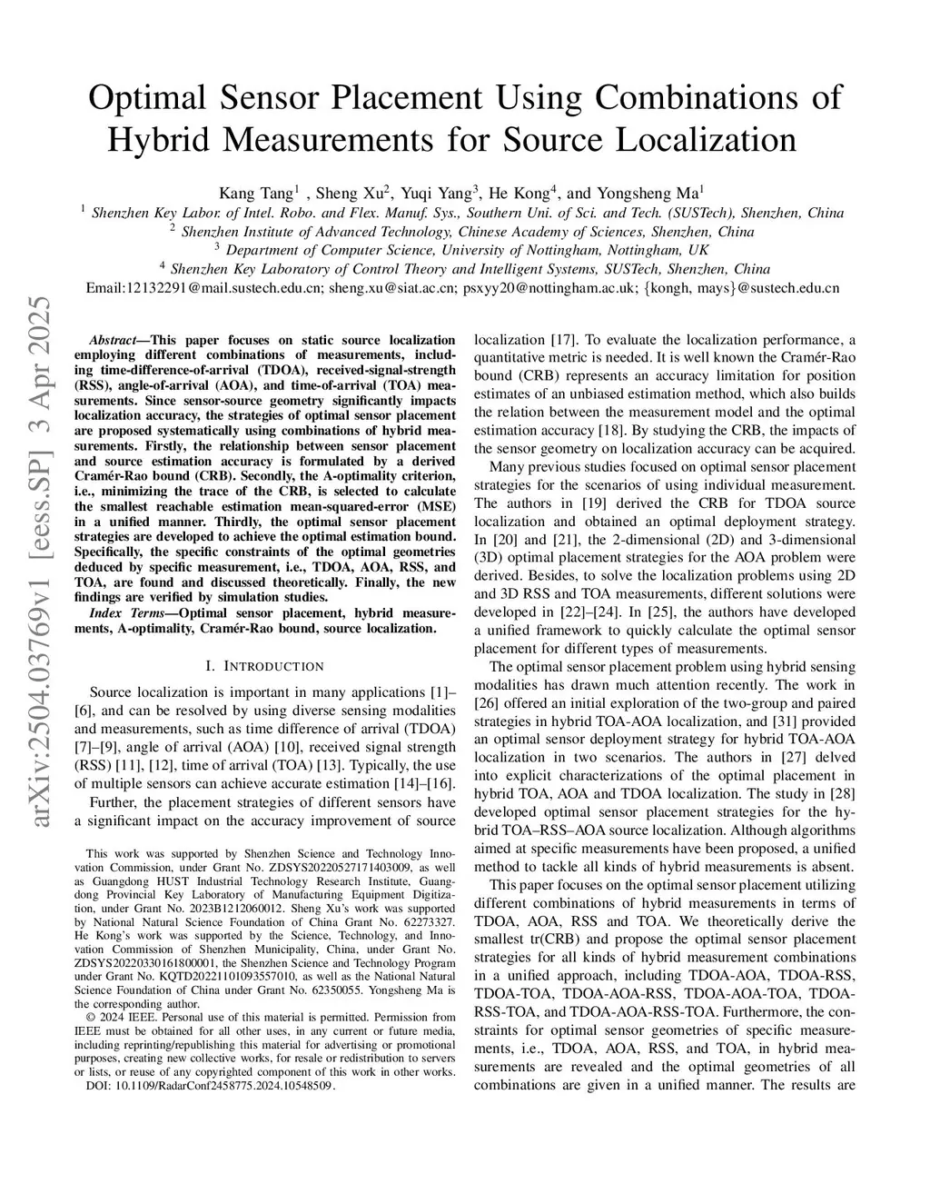 Optimal Sensor Placement Using Combinations of Hybrid Measurements for Source Localization