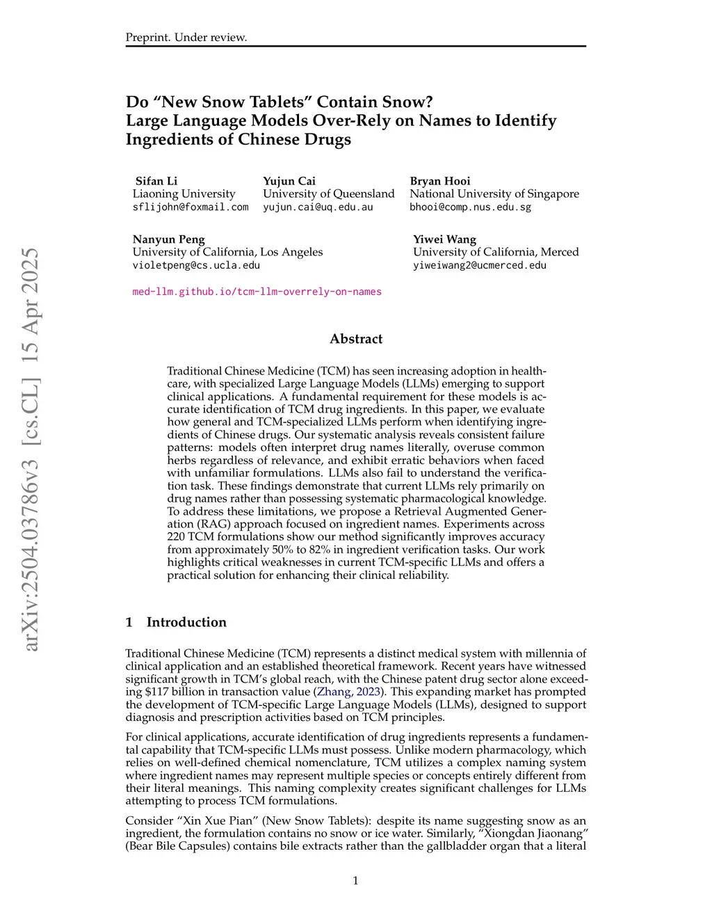 Do "New Snow Tablets" Contain Snow? Large Language Models Over-Rely on Names to Identify Ingredients of Chinese Drugs