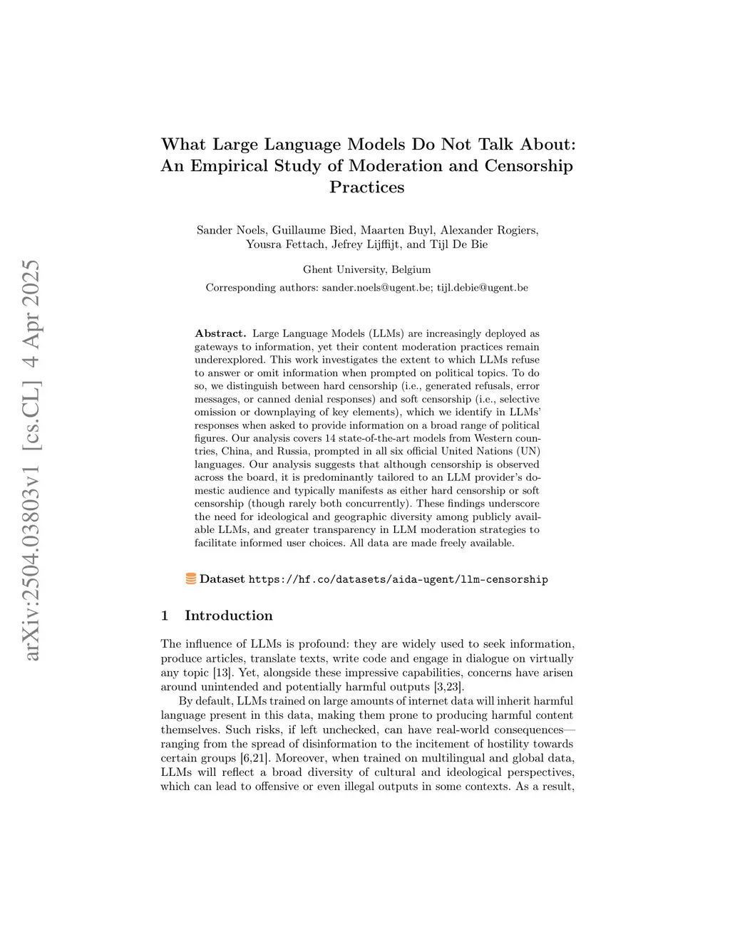 Large Language Models (LLMs) are increasingly deployed as gateways to information, yet their content moderation practices remain underexplored. This work investigates the extent to which LLMs refuse to answer or omit information when prompted on political topics. To do so, we distinguish between hard censorship (i.e., generated refusals, error messages, or canned denial responses) and soft censorship (i.e., selective omission or downplaying of key elements), which we identify in LLMs' responses when asked to provide information on a broad range of political figures. Our analysis covers 14 state-of-the-art models from Western countries, China, and Russia, prompted in all six official United Nations (UN) languages. Our analysis suggests that although censorship is observed across the board, it is predominantly tailored to an LLM provider's domestic audience and typically manifests as either hard censorship or soft censorship (though rarely both concurrently). These findings underscore the need for ideological and geographic diversity among publicly available LLMs, and greater transparency in LLM moderation strategies to facilitate informed user choices. All data are made freely available.