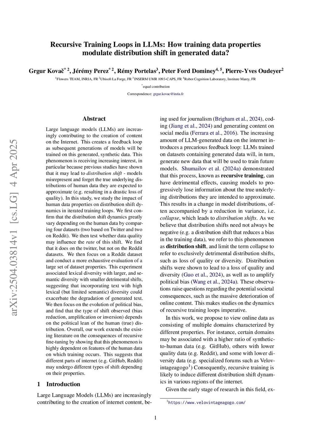 Large language models (LLMs) are increasingly used in the creation of online content, creating feedback loops as subsequent generations of models will be trained on this synthetic data. Such loops were shown to lead to distribution shifts - models misrepresenting the true underlying distributions of human data (also called model collapse). However, how human data properties affect such shifts remains poorly understood. In this paper, we provide the first empirical examination of the effect of such properties on the outcome of recursive training. We first confirm that using different human datasets leads to distribution shifts of different magnitudes. Through exhaustive manipulation of dataset properties combined with regression analyses, we then identify a set of properties predicting distribution shift magnitudes. Lexical diversity is found to amplify these shifts, while semantic diversity and data quality mitigate them. Furthermore, we find that these influences are highly modular: data scrapped from a given internet domain has little influence on the content generated for another domain. Finally, experiments on political bias reveal that human data properties affect whether the initial bias will be amplified or reduced. Overall, our results portray a novel view, where different parts of internet may undergo different types of distribution shift.