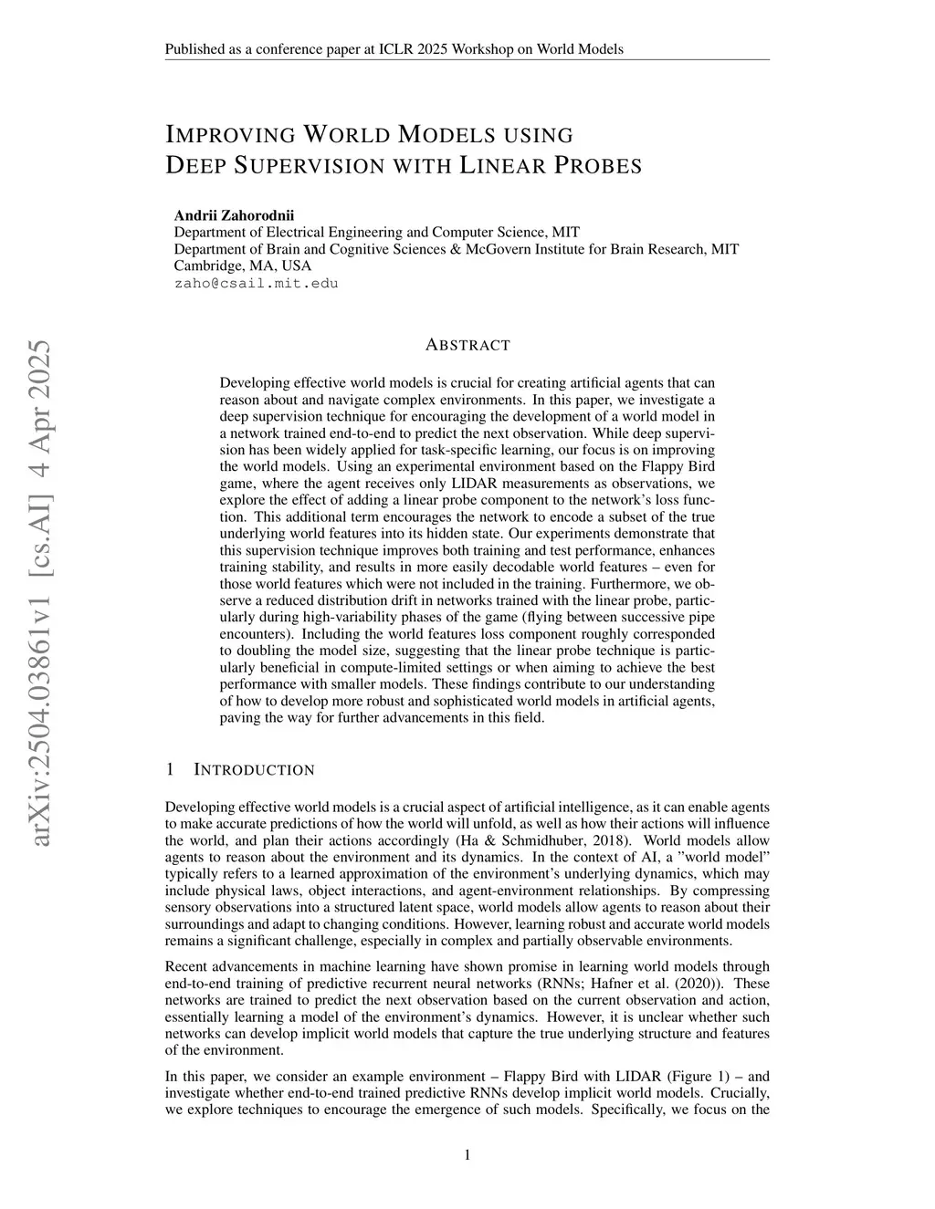 Developing effective world models is crucial for creating artificial agents that can reason about and navigate complex environments. In this paper, we investigate a deep supervision technique for encouraging the development of a world model in a network trained end-to-end to predict the next observation. While deep supervision has been widely applied for task-specific learning, our focus is on improving the world models. Using an experimental environment based on the Flappy Bird game, where the agent receives only LIDAR measurements as observations, we explore the effect of adding a linear probe component to the network's loss function. This additional term encourages the network to encode a subset of the true underlying world features into its hidden state. Our experiments demonstrate that this supervision technique improves both training and test performance, enhances training stability, and results in more easily decodable world features -- even for those world features which were not included in the training. Furthermore, we observe a reduced distribution drift in networks trained with the linear probe, particularly during high-variability phases of the game (flying between successive pipe encounters). Including the world features loss component roughly corresponded to doubling the model size, suggesting that the linear probe technique is particularly beneficial in compute-limited settings or when aiming to achieve the best performance with smaller models. These findings contribute to our understanding of how to develop more robust and sophisticated world models in artificial agents, paving the way for further advancements in this field.
