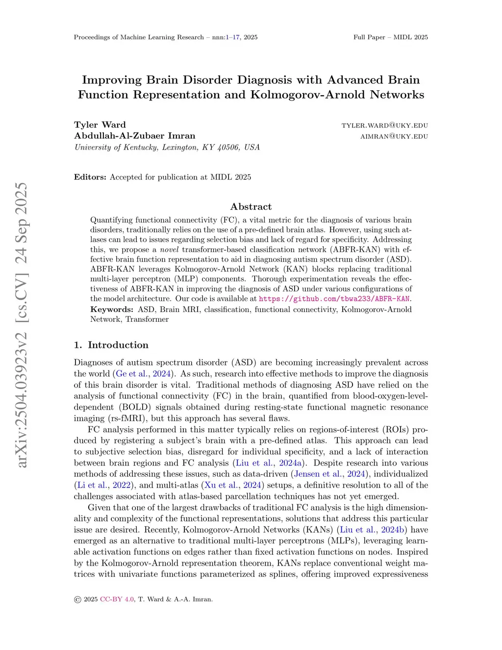 Improving Brain Disorder Diagnosis with Advanced Brain Function Representation and Kolmogorov-Arnold Networks