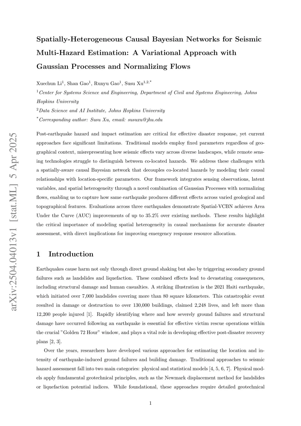 Post-earthquake hazard and impact estimation are critical for effective disaster response, yet current approaches face significant limitations. Traditional models employ fixed parameters regardless of geographical context, misrepresenting how seismic effects vary across diverse landscapes, while remote sensing technologies struggle to distinguish between co-located hazards. We address these challenges with a spatially-aware causal Bayesian network that decouples co-located hazards by modeling their causal relationships with location-specific parameters. Our framework integrates sensing observations, latent variables, and spatial heterogeneity through a novel combination of Gaussian Processes with normalizing flows, enabling us to capture how same earthquake produces different effects across varied geological and topographical features. Evaluations across three earthquakes demonstrate Spatial-VCBN achieves Area Under the Curve (AUC) improvements of up to 35.2% over existing methods. These results highlight the critical importance of modeling spatial heterogeneity in causal mechanisms for accurate disaster assessment, with direct implications for improving emergency response resource allocation.