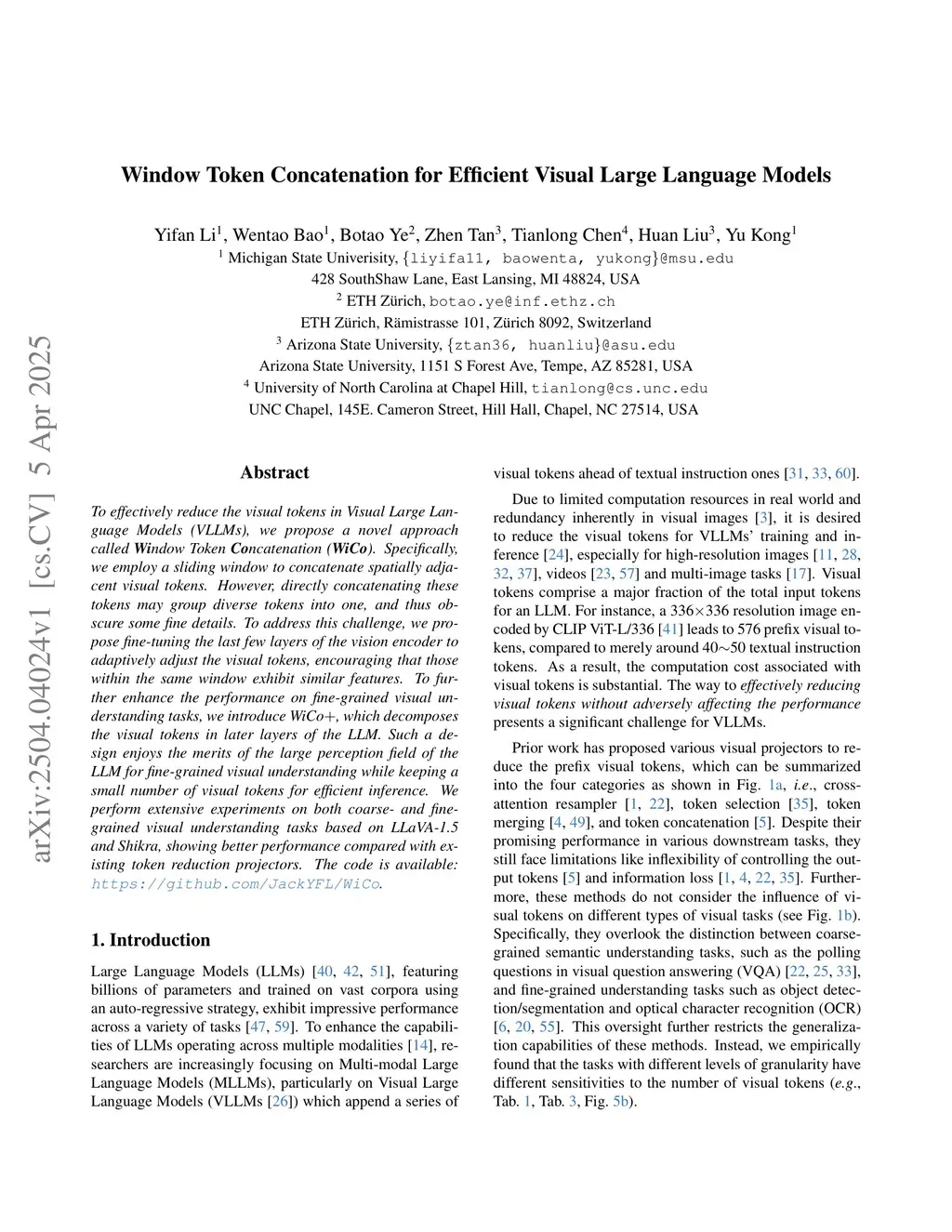 To effectively reduce the visual tokens in Visual Large Language Models (VLLMs), we propose a novel approach called Window Token Concatenation (WiCo). Specifically, we employ a sliding window to concatenate spatially adjacent visual tokens. However, directly concatenating these tokens may group diverse tokens into one, and thus obscure some fine details. To address this challenge, we propose fine-tuning the last few layers of the vision encoder to adaptively adjust the visual tokens, encouraging that those within the same window exhibit similar features. To further enhance the performance on fine-grained visual understanding tasks, we introduce WiCo+, which decomposes the visual tokens in later layers of the LLM. Such a design enjoys the merits of the large perception field of the LLM for fine-grained visual understanding while keeping a small number of visual tokens for efficient inference. We perform extensive experiments on both coarse- and fine-grained visual understanding tasks based on LLaVA-1.5 and Shikra, showing better performance compared with existing token reduction projectors. The code is available:this https URL.