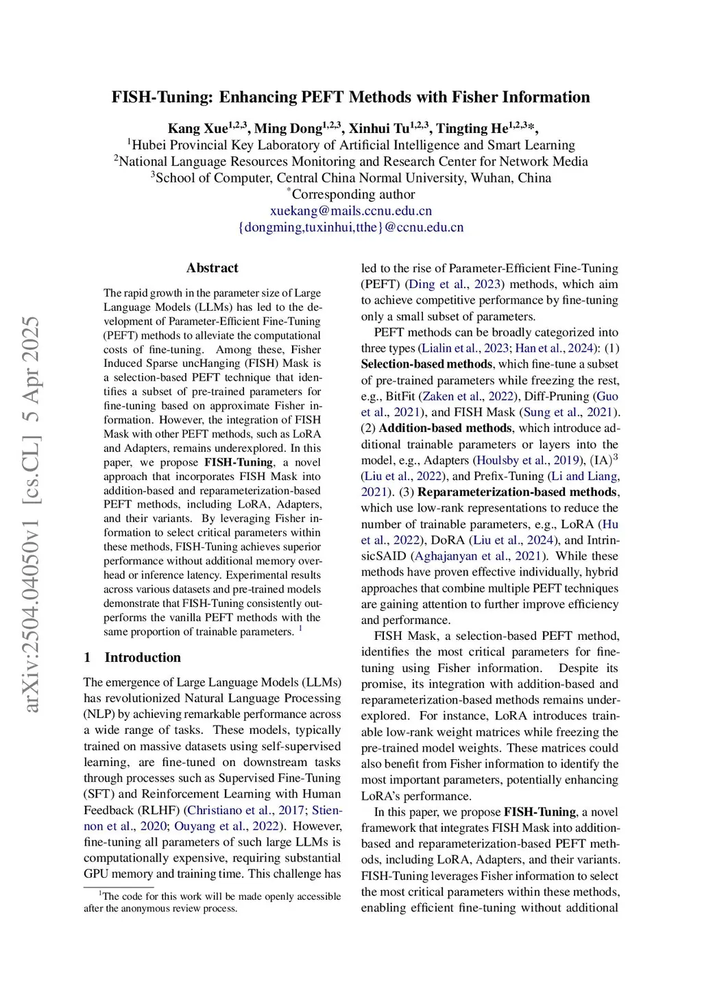 The rapid growth in the parameter size of Large Language Models (LLMs) has spurred the development of Parameter-Efficient Fine-Tuning (PEFT) methods to mitigate the substantial computational costs of fine-tuning. Among these, Fisher Induced Sparse uncHanging (FISH) Mask is a selection-based PEFT technique that identifies a critical subset of pre-trained parameters using approximate Fisher information. While addition-based and reparameterization-based PEFT methods like LoRA and Adapter already fine-tune only a small number of parameters, the newly introduced parameters within these methods themselves present an opportunity for further optimization. Selectively fine-tuning only the most impactful among these new parameters could further reduce resource consumption while maintaining, or even improving, fine-tuning effectiveness. In this paper, we propose \textbf{FISH-Tuning}, a novel approach that incorporates FISH Mask into such PEFT methods, including LoRA, Adapter, and their variants. By leveraging Fisher information to identify and update only the most significant parameters within these added or reparameterized components, FISH-Tuning aims to achieve superior performance without increasing training time or inference latency compared to the vanilla PEFT methods. Experimental results across various datasets and pre-trained models demonstrate that FISH-Tuning consistently outperforms the vanilla PEFT methods when using the same proportion of trainable parameters. Code is available atthis https URL.