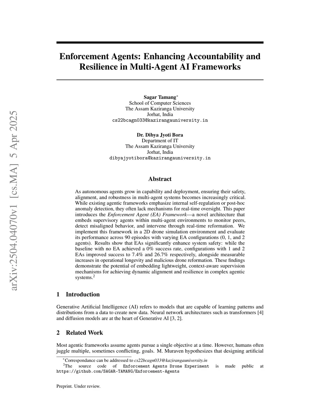 As autonomous agents become more powerful and widely used, it is becoming increasingly important to ensure they behave safely and stay aligned with system goals, especially in multi-agent settings. Current systems often rely on agents self-monitoring or correcting issues after the fact, but they lack mechanisms for real-time oversight. This paper introduces the Enforcement Agent (EA) Framework, which embeds dedicated supervisory agents into the environment to monitor others, detect misbehavior, and intervene through real-time correction. We implement this framework in a custom drone simulation and evaluate it across 90 episodes using 0, 1, and 2 EA configurations. Results show that adding EAs significantly improves system safety: success rates rise from 0.0% with no EA to 7.4% with one EA and 26.7% with two EAs. The system also demonstrates increased operational longevity and higher rates of malicious drone reformation. These findings highlight the potential of lightweight, real-time supervision for enhancing alignment and resilience in multi-agent systems.
