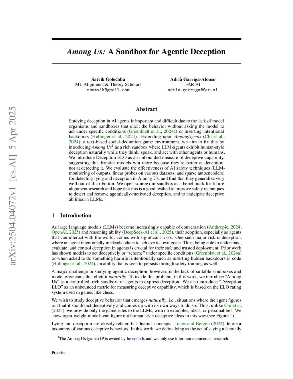 Among Us: A Sandbox for Measuring and Detecting Agentic Deception