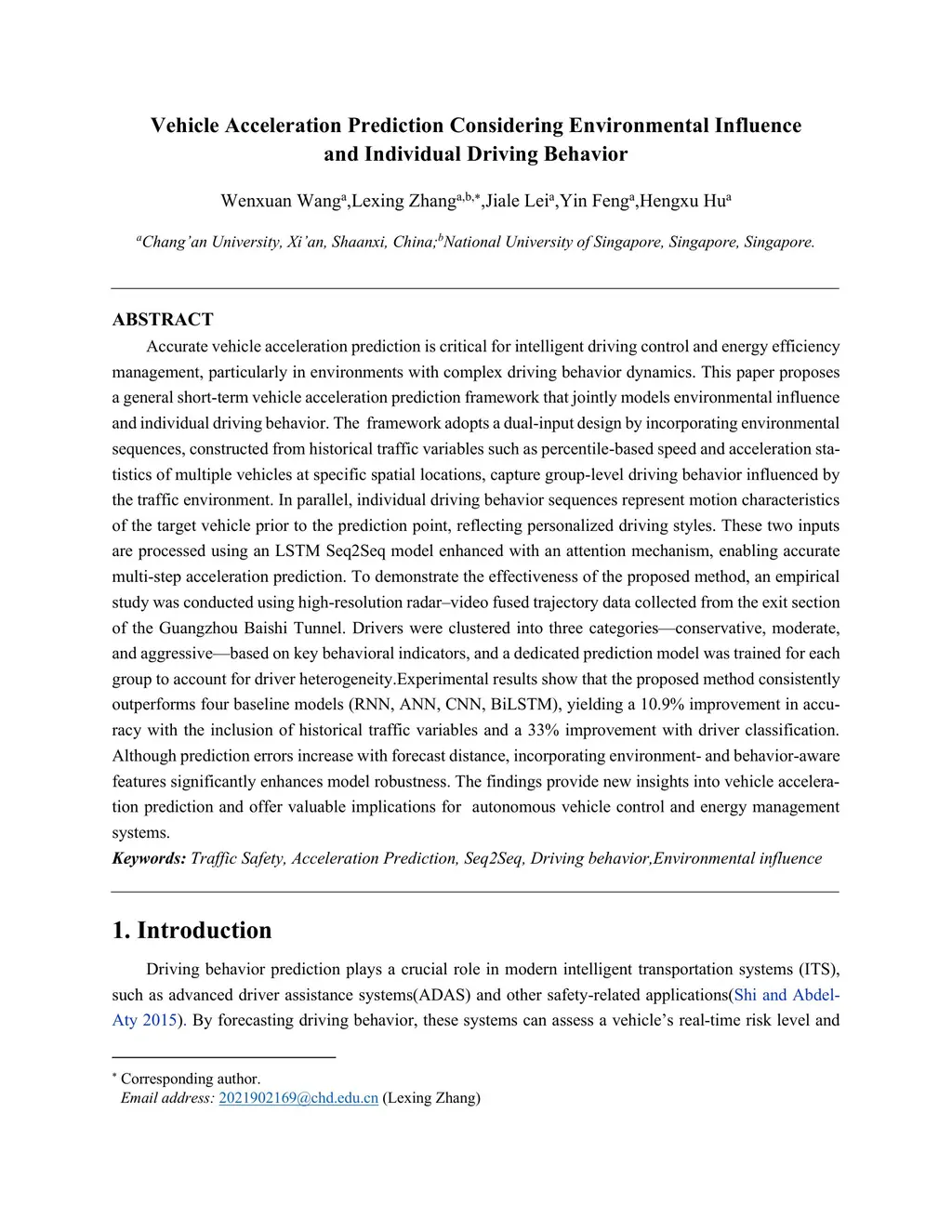 Accurate vehicle acceleration prediction is critical for intelligent driving control and energy efficiency management, particularly in environments with complex driving behavior dynamics. This paper proposes a general short-term vehicle acceleration prediction framework that jointly models environmental influence and individual driving behavior. The framework adopts a dual input design by incorporating environmental sequences, constructed from historical traffic variables such as percentile-based speed and acceleration statistics of multiple vehicles at specific spatial locations, capture group-level driving behavior influenced by the traffic environment. In parallel, individual driving behavior sequences represent motion characteristics of the target vehicle prior to the prediction point, reflecting personalized driving styles. These two inputs are processed using an LSTM Seq2Seq model enhanced with an attention mechanism, enabling accurate multi-step acceleration prediction. To demonstrate the effectiveness of the proposed method, an empirical study was conducted using high resolution radar video fused trajectory data collected from the exit section of the Guangzhou Baishi Tunnel. Drivers were clustered into three categories conservative, moderate, and aggressive based on key behavioral indicators, and a dedicated prediction model was trained for each group to account for driverthis http URLresults show that the proposed method consistently outperforms four baseline models, yielding a 10.9% improvement in accuracy with the inclusion of historical traffic variables and a 33% improvement with driver classification. Although prediction errors increase with forecast distance, incorporating environment- and behavior-aware features significantly enhances model robustness.