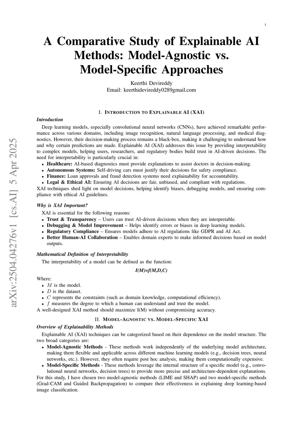 This paper compares model-agnostic and model-specific approaches to explainable AI (XAI) in deep learning image classification. I examine how LIME and SHAP (model-agnostic methods) differ from Grad-CAM and Guided Backpropagation (model-specific methods) when interpreting ResNet50 predictions across diverse image categories. Through extensive testing with various species from dogs and birds to insects I found that each method reveals different aspects of the models decision-making process. Model-agnostic techniques provide broader feature attribution that works across different architectures, while model-specific approaches excel at highlighting precise activation regions with greater computational efficiency. My analysis shows there is no "one-size-fits-all" solution for model interpretability. Instead, combining multiple XAI methods offers the most comprehensive understanding of complex models particularly valuable in high-stakes domains like healthcare, autonomous vehicles, and financial services where transparency is crucial. This comparative framework provides practical guidance for selecting appropriate interpretability techniques based on specific application needs and computational constraints.
