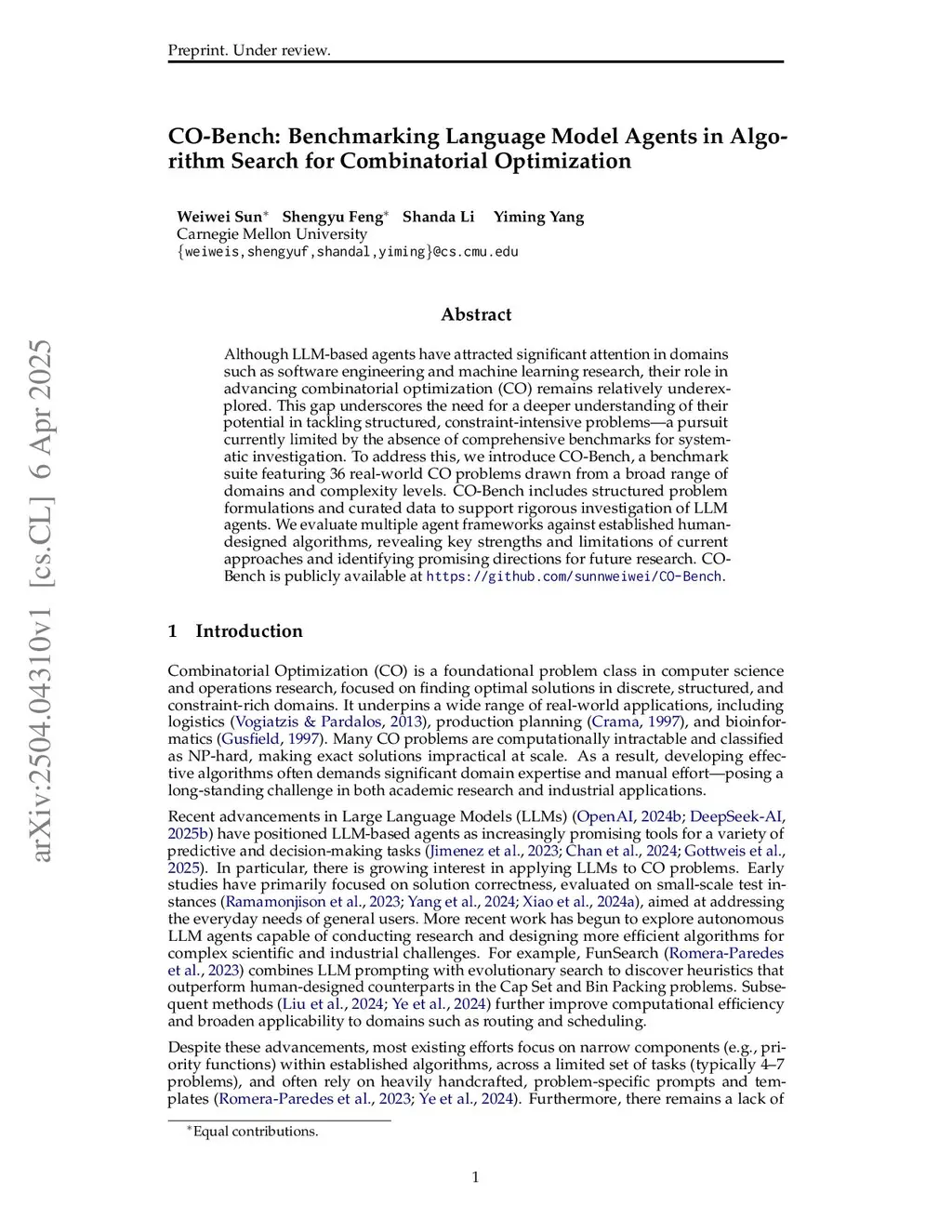 Although LLM-based agents have attracted significant attention in domains such as software engineering and machine learning research, their role in advancing combinatorial optimization (CO) remains relatively underexplored. This gap underscores the need for a deeper understanding of their potential in tackling structured, constraint-intensive problems -- a pursuit currently limited by the absence of comprehensive benchmarks for systematic investigation. To address this, we introduce CO-Bench, a benchmark suite featuring 36 real-world CO problems drawn from a broad range of domains and complexity levels. CO-Bench includes structured problem formulations and curated data to support rigorous investigation of LLM agents. We evaluate multiple agentic frameworks against established human-designed algorithms, revealing the strengths and limitations of existing LLM agents and identifying promising directions for future research. CO-Bench is publicly available at this https URL.
