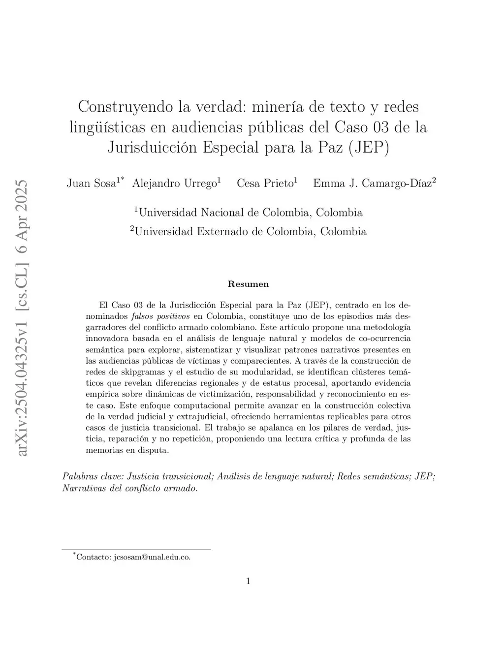Case 03 of the Special Jurisdiction for Peace (JEP), focused on the so-called false positives in Colombia, represents one of the most harrowing episodes of the Colombian armed conflict. This article proposes an innovative methodology based on natural language analysis and semantic co-occurrence models to explore, systematize, and visualize narrative patterns present in the public hearings of victims and appearing parties. By constructing skipgram networks and analyzing their modularity, the study identifies thematic clusters that reveal regional and procedural status differences, providing empirical evidence on dynamics of victimization, responsibility, and acknowledgment in this case. This computational approach contributes to the collective construction of both judicial and extrajudicial truth, offering replicable tools for other transitional justice cases. The work is grounded in the pillars of truth, justice, reparation, and non-repetition, proposing a critical and in-depth reading of contested memories.