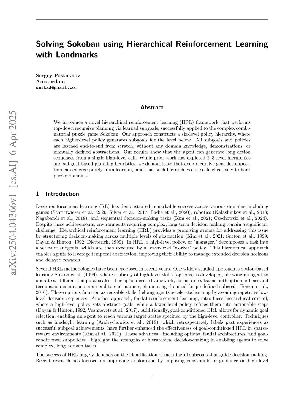 We introduce a novel hierarchical reinforcement learning (HRL) framework that performs top-down recursive planning via learned subgoals, successfully applied to the complex combinatorial puzzle game Sokoban. Our approach constructs a six-level policy hierarchy, where each higher-level policy generates subgoals for the level below. All subgoals and policies are learned end-to-end from scratch, without any domain knowledge. Our results show that the agent can generate long action sequences from a single high-level call. While prior work has explored 2-3 level hierarchies and subgoal-based planning heuristics, we demonstrate that deep recursive goal decomposition can emerge purely from learning, and that such hierarchies can scale effectively to hard puzzle domains.