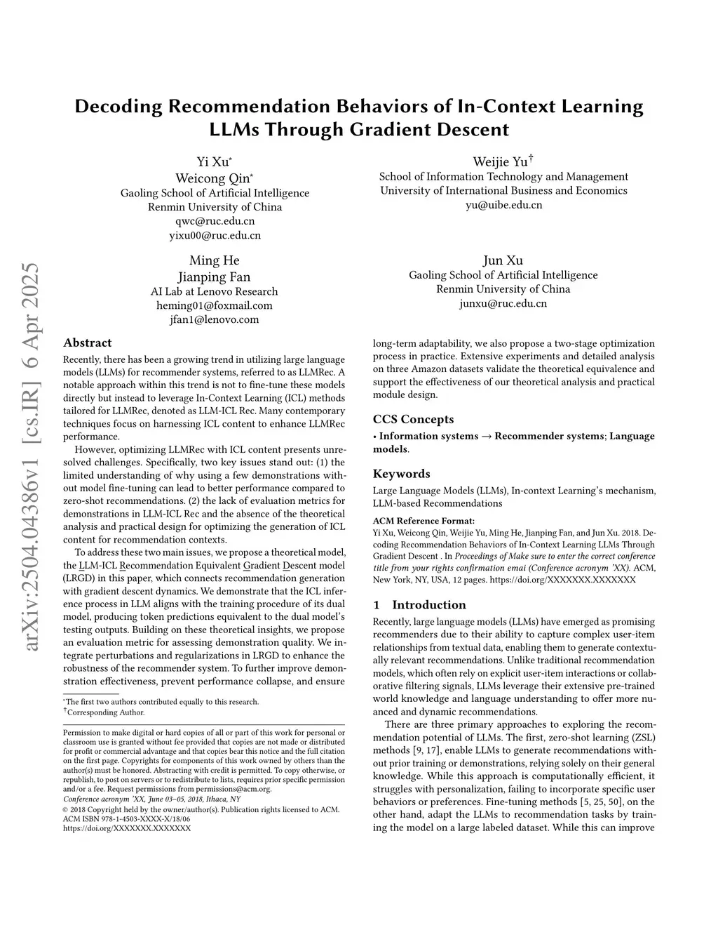 Recently, there has been a growing trend in utilizing large language models (LLMs) for recommender systems, referred to as LLMRec. A notable approach within this trend is not to fine-tune these models directly but instead to leverage In-Context Learning (ICL) methods tailored for LLMRec, denoted as LLM-ICL Rec. Many contemporary techniques focus on harnessing ICL content to enhance LLMRec performance.However, optimizing LLMRec with ICL content presents unresolved challenges. Specifically, two key issues stand out: (1) the limited understanding of why using a few demonstrations without model fine-tuning can lead to better performance compared to zero-shot recommendations. (2) the lack of evaluation metrics for demonstrations in LLM-ICL Rec and the absence of the theoretical analysis and practical design for optimizing the generation of ICL content for recommendation contexts.To address these two main issues, we propose a theoretical model, the LLM-ICL Recommendation Equivalent Gradient Descent model (LRGD) in this paper, which connects recommendation generation with gradient descent dynamics. We demonstrate that the ICL inference process in LLM aligns with the training procedure of its dual model, producing token predictions equivalent to the dual model's testing outputs. Building on these theoretical insights, we propose an evaluation metric for assessing demonstration quality. We integrate perturbations and regularizations in LRGD to enhance the robustness of the recommender system. To further improve demonstration effectiveness, prevent performance collapse, and ensure long-term adaptability, we also propose a two-stage optimization process in practice. Extensive experiments and detailed analysis on three Amazon datasets validate the theoretical equivalence and support the effectiveness of our theoretical analysis and practical module design.