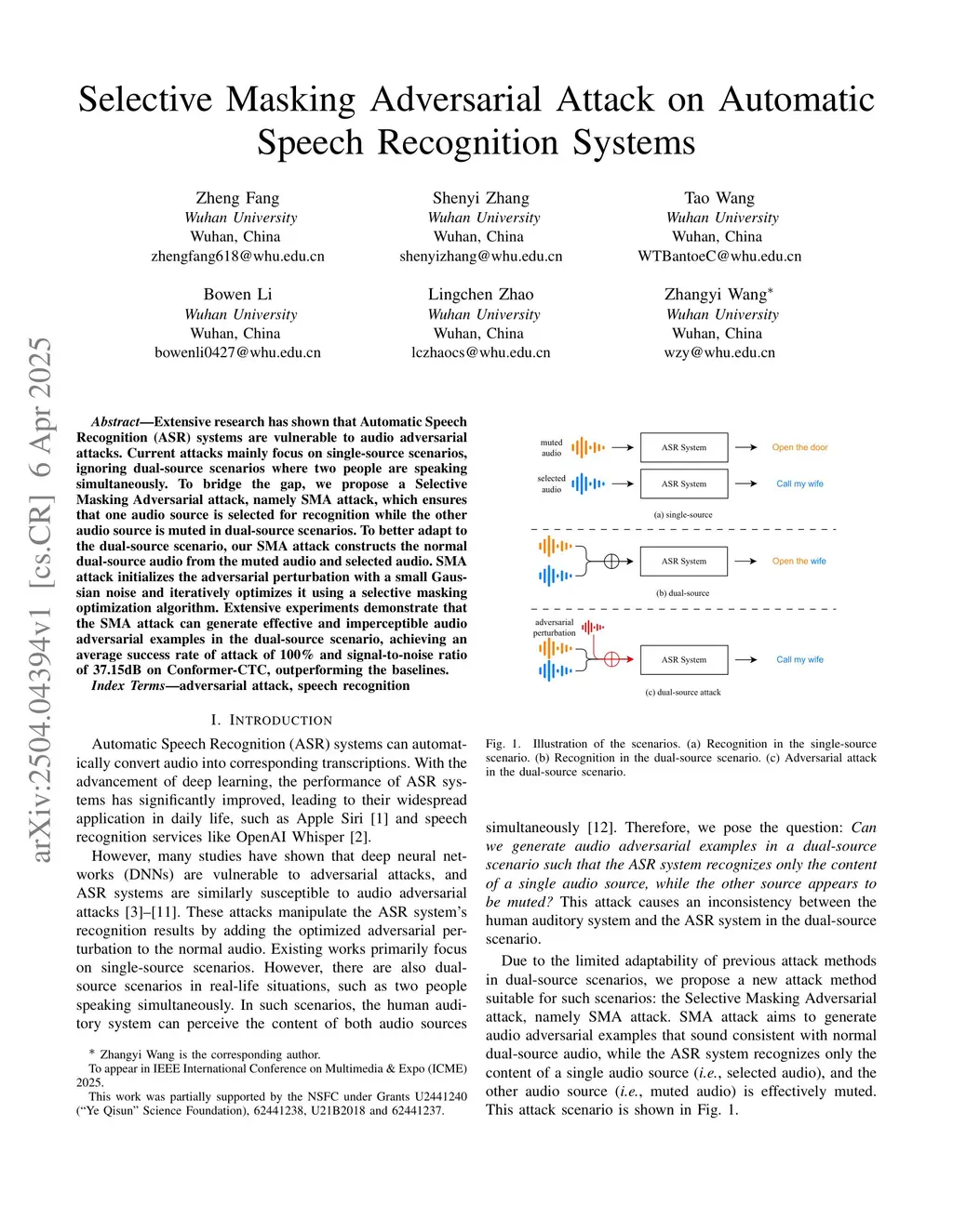 Extensive research has shown that Automatic Speech Recognition (ASR) systems are vulnerable to audio adversarial attacks. Current attacks mainly focus on single-source scenarios, ignoring dual-source scenarios where two people are speaking simultaneously. To bridge the gap, we propose a Selective Masking Adversarial attack, namely SMA attack, which ensures that one audio source is selected for recognition while the other audio source is muted in dual-source scenarios. To better adapt to the dual-source scenario, our SMA attack constructs the normal dual-source audio from the muted audio and selected audio. SMA attack initializes the adversarial perturbation with a small Gaussian noise and iteratively optimizes it using a selective masking optimization algorithm. Extensive experiments demonstrate that the SMA attack can generate effective and imperceptible audio adversarial examples in the dual-source scenario, achieving an average success rate of attack of 100% and signal-to-noise ratio of 37.15dB on Conformer-CTC, outperforming the baselines.