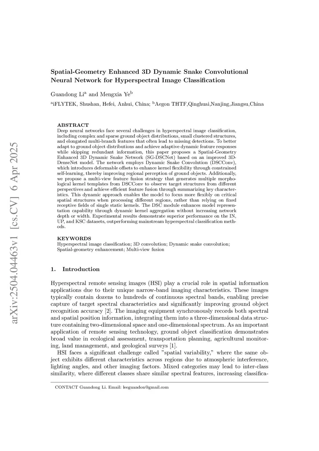 Deep neural networks face several challenges in hyperspectral image classification, including complex and sparse ground object distributions, small clustered structures, and elongated multi-branch features that often lead to missing detections. To better adapt to ground object distributions and achieve adaptive dynamic feature responses while skipping redundant information, this paper proposes a Spatial-Geometry Enhanced 3D Dynamic Snake Network (SG-DSCNet) based on an improved 3D-DenseNet model. The network employs Dynamic Snake Convolution (DSCConv), which introduces deformable offsets to enhance kernel flexibility through constrained self-learning, thereby improving regional perception of ground objects. Additionally, we propose a multi-view feature fusion strategy that generates multiple morphological kernel templates from DSCConv to observe target structures from different perspectives and achieve efficient feature fusion through summarizing key characteristics. This dynamic approach enables the model to focus more flexibly on critical spatial structures when processing different regions, rather than relying on fixed receptive fields of single static kernels. The DSC module enhances model representation capability through dynamic kernel aggregation without increasing network depth or width. Experimental results demonstrate superior performance on the IN, UP, and KSC datasets, outperforming mainstream hyperspectral classification methods.