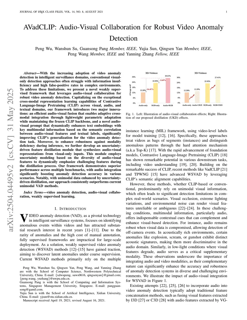 With the increasing adoption of video anomaly detection in intelligent surveillance domains, conventional visual-based detection approaches often struggle with information insufficiency and high false-positive rates in complex environments. To address these limitations, we present a novel weakly supervised framework that leverages audio-visual collaboration for robust video anomaly detection. Capitalizing on the exceptional cross-modal representation learning capabilities of Contrastive Language-Image Pretraining (CLIP) across visual, audio, and textual domains, our framework introduces two major innovations: an efficient audio-visual fusion that enables adaptive cross-modal integration through lightweight parametric adaptation while maintaining the frozen CLIP backbone, and a novel audio-visual prompt that dynamically enhances text embeddings with key multimodal information based on the semantic correlation between audio-visual features and textual labels, significantly improving CLIP's generalization for the video anomaly detection task. Moreover, to enhance robustness against modality deficiency during inference, we further develop an uncertainty-driven feature distillation module that synthesizes audio-visual representations from visual-only inputs. This module employs uncertainty modeling based on the diversity of audio-visual features to dynamically emphasize challenging features during the distillation process. Our framework demonstrates superior performance across multiple benchmarks, with audio integration significantly boosting anomaly detection accuracy in various scenarios. Notably, with unimodal data enhanced by uncertainty-driven distillation, our approach consistently outperforms current unimodal VAD methods.