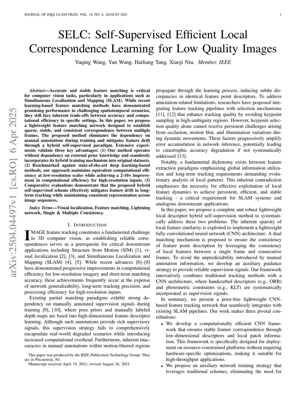 SELC: Self-Supervised Efficient Local Correspondence Learning for Low Quality Images