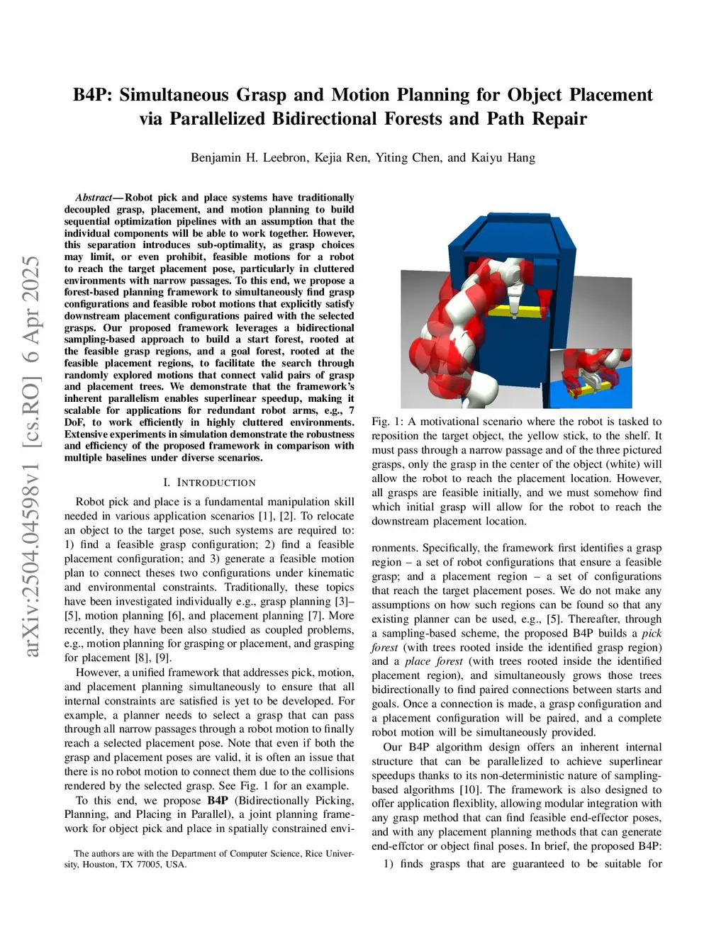 B4P: Simultaneous Grasp and Motion Planning for Object Placement via Parallelized Bidirectional Forests and Path Repair