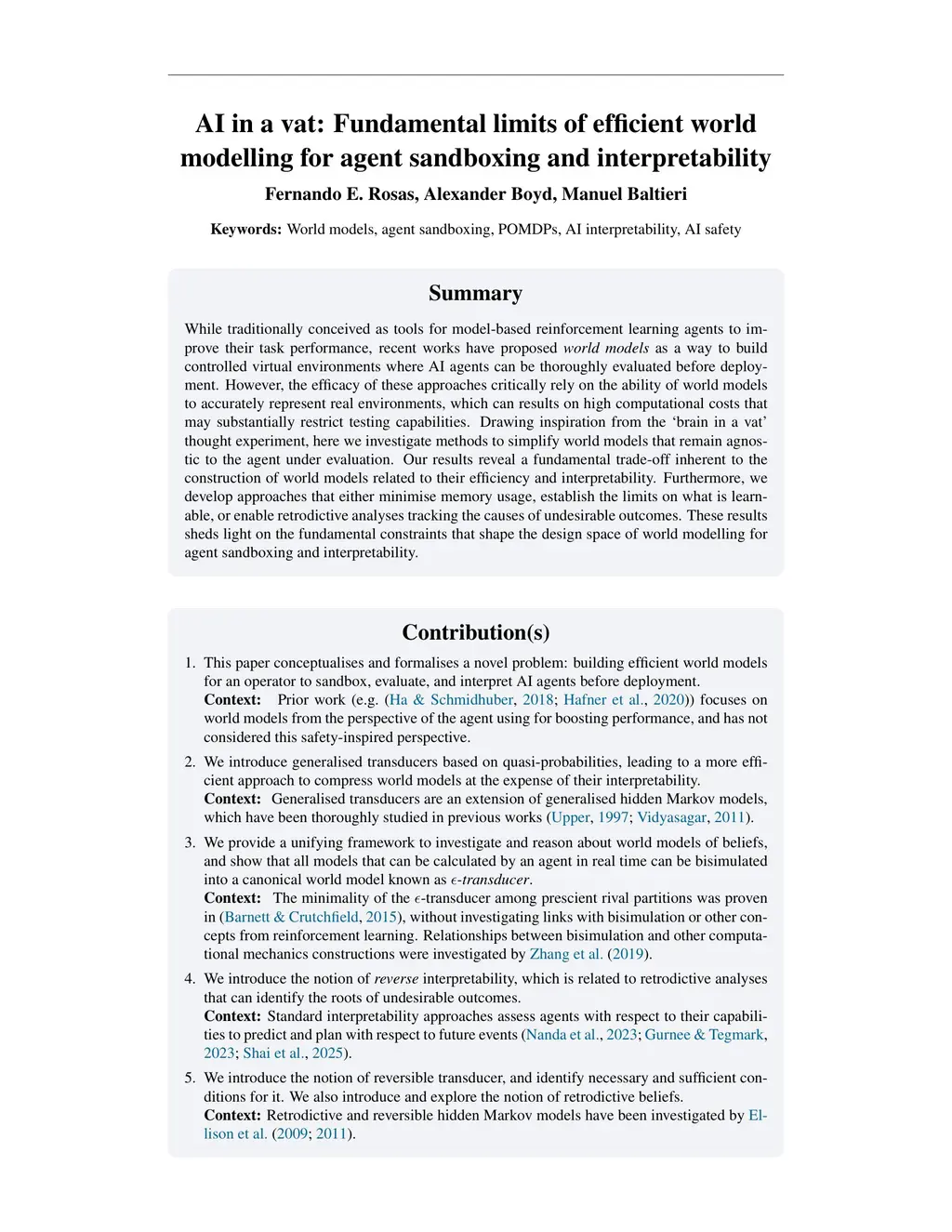 AI in a vat: Fundamental limits of efficient world modelling for agent sandboxing and interpretability