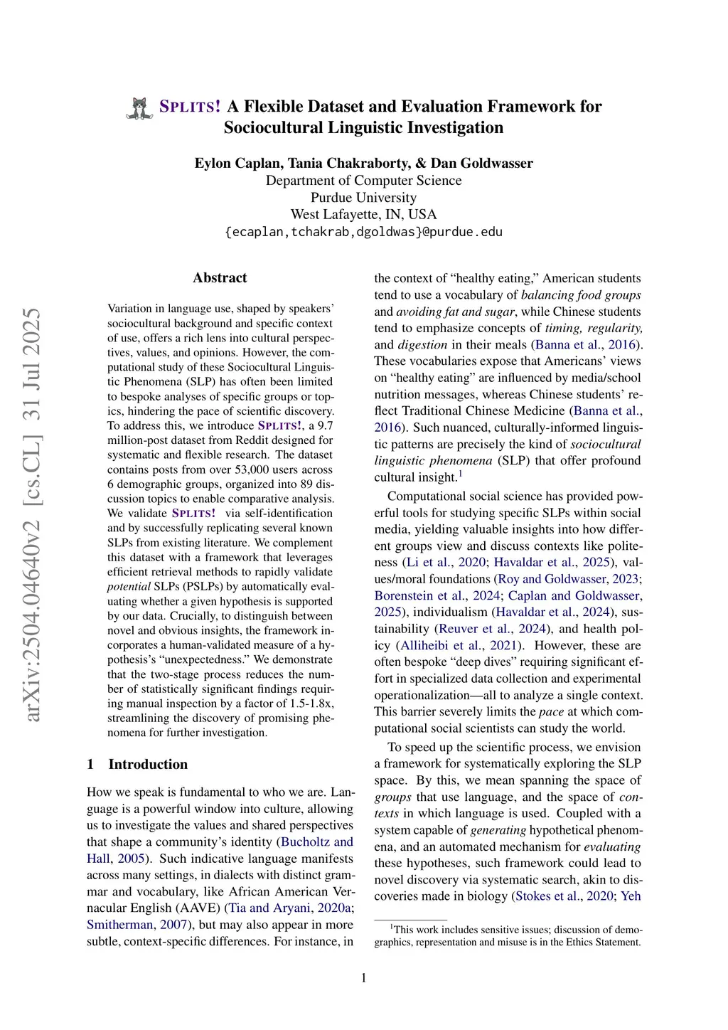 Splits! A Flexible Dataset and Evaluation Framework for Sociocultural Linguistic Investigation