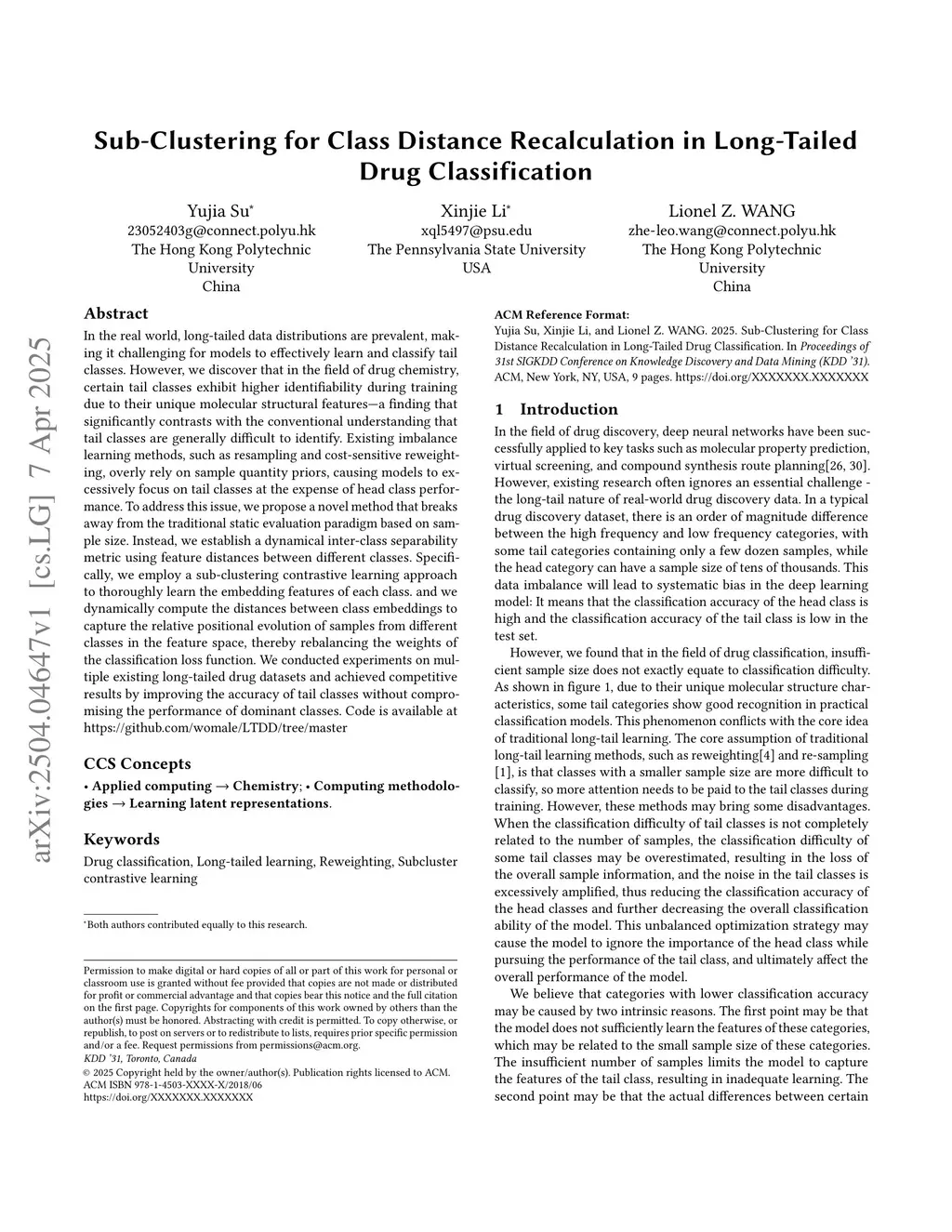 In the real world, long-tailed data distributions are prevalent, making it challenging for models to effectively learn and classify tail classes. However, we discover that in the field of drug chemistry, certain tail classes exhibit higher identifiability during training due to their unique molecular structural features, a finding that significantly contrasts with the conventional understanding that tail classes are generally difficult to identify. Existing imbalance learning methods, such as resampling and cost-sensitive reweighting, overly rely on sample quantity priors, causing models to excessively focus on tail classes at the expense of head class performance. To address this issue, we propose a novel method that breaks away from the traditional static evaluation paradigm based on sample size. Instead, we establish a dynamical inter-class separability metric using feature distances between different classes. Specifically, we employ a sub-clustering contrastive learning approach to thoroughly learn the embedding features of each class, and we dynamically compute the distances between class embeddings to capture the relative positional evolution of samples from different classes in the feature space, thereby rebalancing the weights of the classification loss function. We conducted experiments on multiple existing long-tailed drug datasets and achieved competitive results by improving the accuracy of tail classes without compromising the performance of dominant classes.