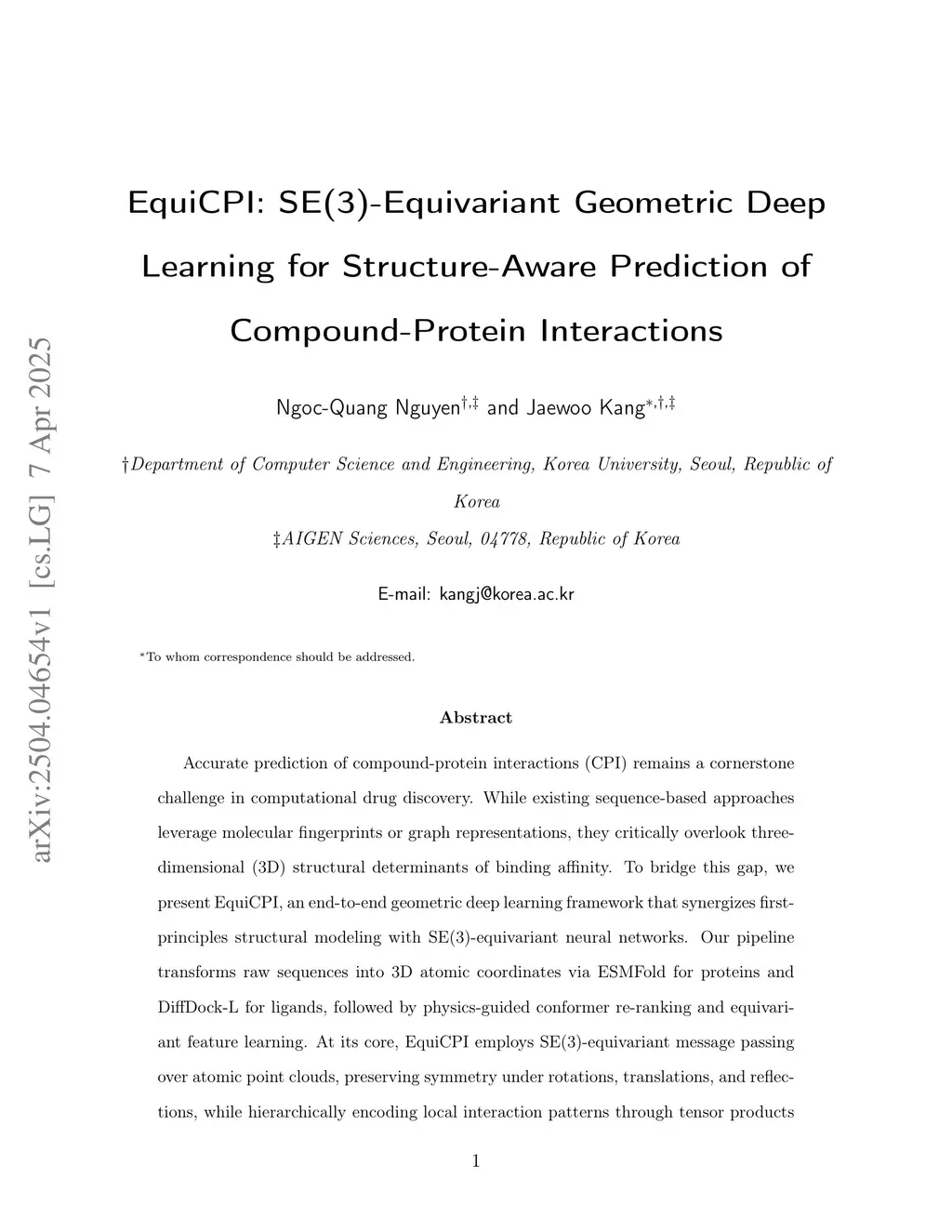 Accurate prediction of compound-protein interactions (CPI) remains a cornerstone challenge in computational drug discovery. While existing sequence-based approaches leverage molecular fingerprints or graph representations, they critically overlook three-dimensional (3D) structural determinants of binding affinity. To bridge this gap, we present EquiCPI, an end-to-end geometric deep learning framework that synergizes first-principles structural modeling with SE(3)-equivariant neural networks. Our pipeline transforms raw sequences into 3D atomic coordinates via ESMFold for proteins and DiffDock-L for ligands, followed by physics-guided conformer re-ranking and equivariant feature learning. At its core, EquiCPI employs SE(3)-equivariant message passing over atomic point clouds, preserving symmetry under rotations, translations, and reflections, while hierarchically encoding local interaction patterns through tensor products of spherical harmonics. The proposed model is evaluated on BindingDB (affinity prediction) and DUD-E (virtual screening), EquiCPI achieves performance on par with or exceeding the state-of-the-art deep learning competitors.