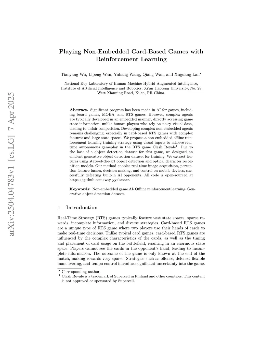 Significant progress has been made in AI for games, including board games, MOBA, and RTS games. However, complex agents are typically developed in an embedded manner, directly accessing game state information, unlike human players who rely on noisy visual data, leading to unfair competition. Developing complex non-embedded agents remains challenging, especially in card-based RTS games with complex features and large state spaces. We propose a non-embedded offline reinforcement learning training strategy using visual inputs to achieve real-time autonomous gameplay in the RTS game Clash Royale. Due to the lack of a object detection dataset for this game, we designed an efficient generative object detection dataset for training. We extract features using state-of-the-art object detection and optical character recognition models. Our method enables real-time image acquisition, perception feature fusion, decision-making, and control on mobile devices, successfully defeating built-in AI opponents. All code is open-sourced atthis https URL.