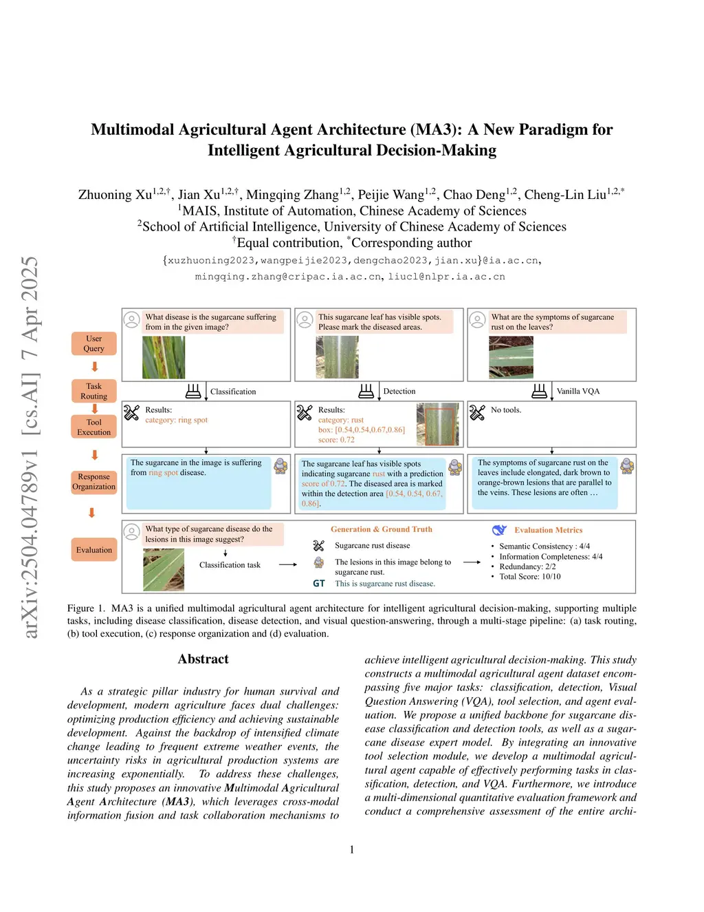 As a strategic pillar industry for human survival and development, modern agriculture faces dual challenges: optimizing production efficiency and achieving sustainable development. Against the backdrop of intensified climate change leading to frequent extreme weather events, the uncertainty risks in agricultural production systems are increasing exponentially. To address these challenges, this study proposes an innovative \textbf{M}ultimodal \textbf{A}gricultural \textbf{A}gent \textbf{A}rchitecture (\textbf{MA3}), which leverages cross-modal information fusion and task collaboration mechanisms to achieve intelligent agricultural decision-making. This study constructs a multimodal agricultural agent dataset encompassing five major tasks: classification, detection, Visual Question Answering (VQA), tool selection, and agent evaluation. We propose a unified backbone for sugarcane disease classification and detection tools, as well as a sugarcane disease expert model. By integrating an innovative tool selection module, we develop a multimodal agricultural agent capable of effectively performing tasks in classification, detection, and VQA. Furthermore, we introduce a multi-dimensional quantitative evaluation framework and conduct a comprehensive assessment of the entire architecture over our evaluation dataset, thereby verifying the practicality and robustness of MA3 in agricultural scenarios. This study provides new insights and methodologies for the development of agricultural agents, holding significant theoretical and practical implications. Our source code and dataset will be made publicly available upon acceptance.