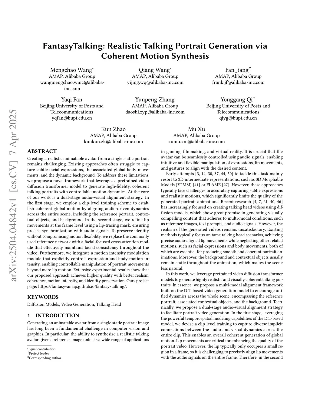Creating a realistic animatable avatar from a single static portrait remains challenging. Existing approaches often struggle to capture subtle facial expressions, the associated global body movements, and the dynamic background. To address these limitations, we propose a novel framework that leverages a pretrained video diffusion transformer model to generate high-fidelity, coherent talking portraits with controllable motion dynamics. At the core of our work is a dual-stage audio-visual alignment strategy. In the first stage, we employ a clip-level training scheme to establish coherent global motion by aligning audio-driven dynamics across the entire scene, including the reference portrait, contextual objects, and background. In the second stage, we refine lip movements at the frame level using a lip-tracing mask, ensuring precise synchronization with audio signals. To preserve identity without compromising motion flexibility, we replace the commonly used reference network with a facial-focused cross-attention module that effectively maintains facial consistency throughout the video. Furthermore, we integrate a motion intensity modulation module that explicitly controls expression and body motion intensity, enabling controllable manipulation of portrait movements beyond mere lip motion. Extensive experimental results show that our proposed approach achieves higher quality with better realism, coherence, motion intensity, and identity preservation. Ours project page:this https URL.